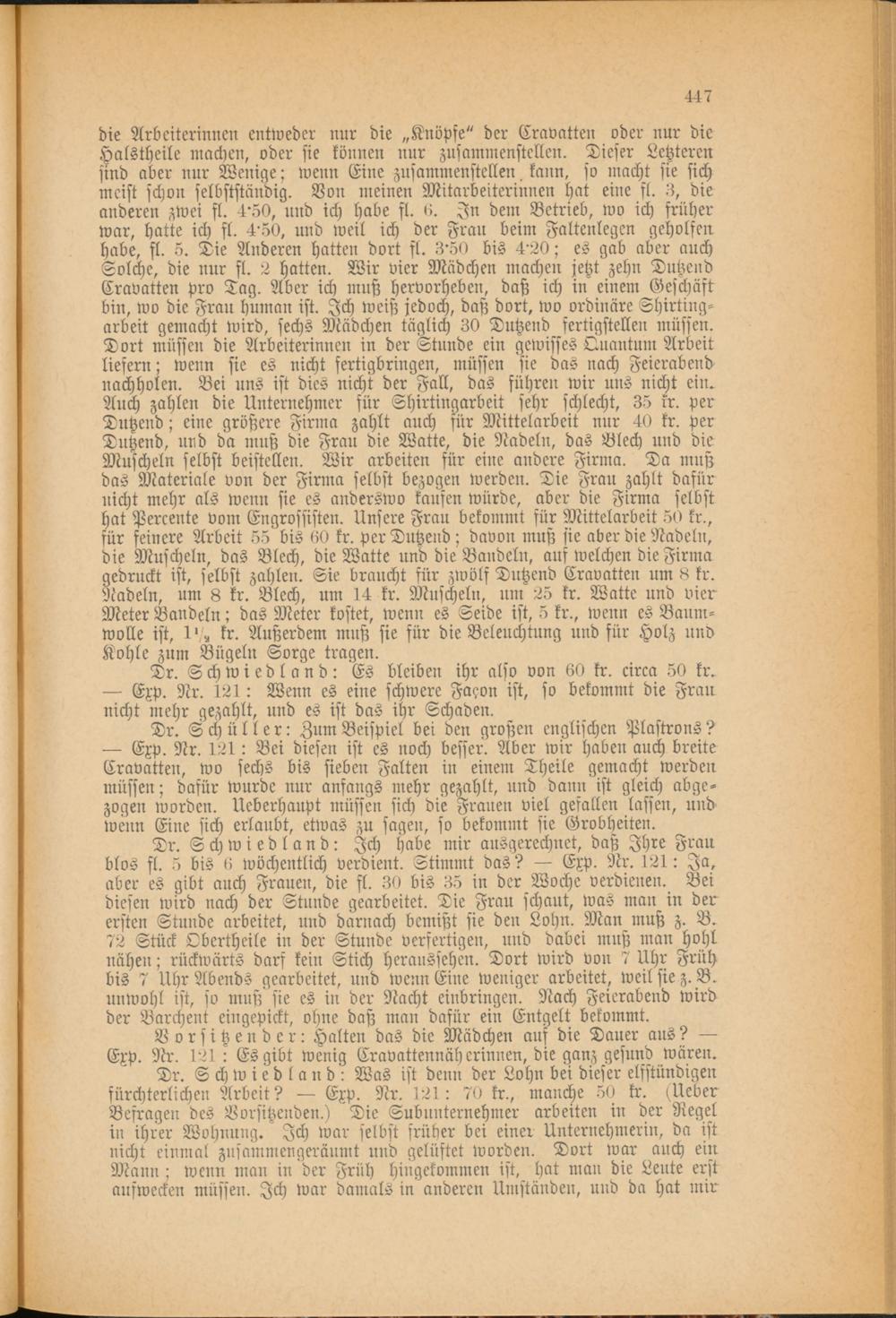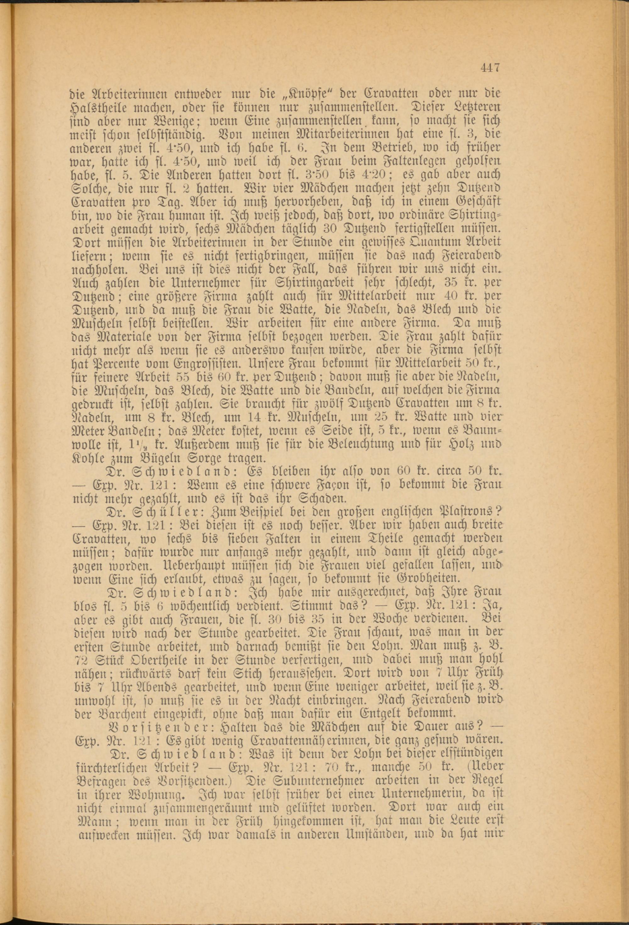 Dr. Schwiedland: Ich habe mir ausgerechnet, daß Ihre Frau blos fl. 5 bis 6 wöchentlich verdient. Stimmt das? — Exp. Nr. 121: Ja, aber es gibt auch Frauen, die fl. 30 bis 35 in der Woche verdienen. Bei diesen wird nach der Stunde gearbeitet. Die Frau schaut, was man in der ersten Stunde arbeitet, und darnach bemißt sie den Lohn. Man muß z. B. 72 Stück Obertheile in der Stunde verfertigen, und dabei muß man hohl nähen; rückwärts darf kein Stich heraussehen. Dort wird von 7 Uhr Früh bis 7 Uhr Abends gearbeitet, und wenn Eine weniger arbeitet, weil sie z.B. unwohl ist, so muß sie es in der Nacht einbringen. Nach Feierabend wird der Barchent eingestickt, ohne daß man dafür ein Entgelt bekommt.