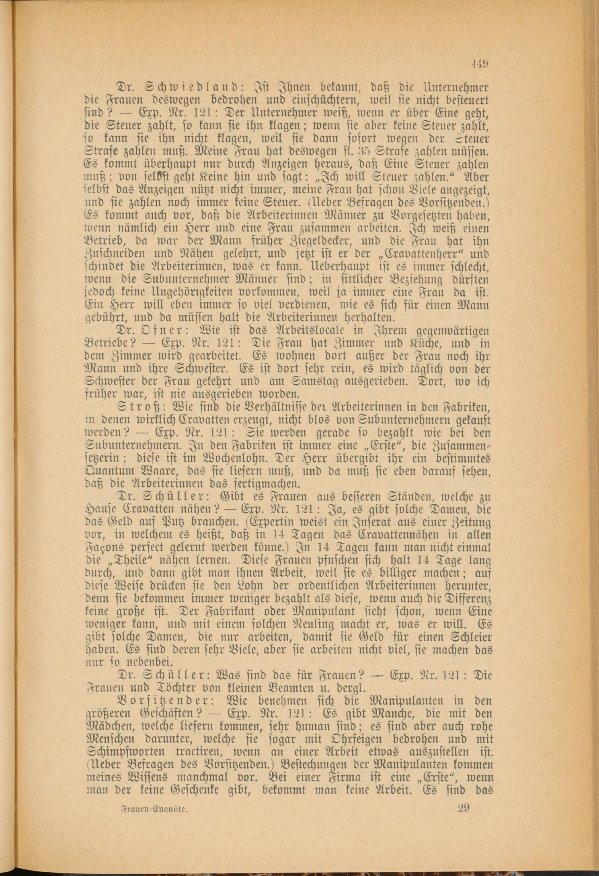 Stroß: Wie sind die Verhältnisse der Arbeiterinnen in den Fabriken, in denen wirklich Cravatten erzeugt, nicht blos von SubUnternehmern gekauft werden? — Exp. Nr. 121: Sie werden gerade so bezahlt wie bei den Lubunternehmern. In den Fabriken ist immer eine „Erste", die Zusammensetzet ; diese ist im Wochenlohn. Der Herr übergibt ihr ein bestimmtes Quantum Waare, das sie liefern muß, und da muß sie eben darauf sehen, daß die Arbeiterinnen das fertigmachen.