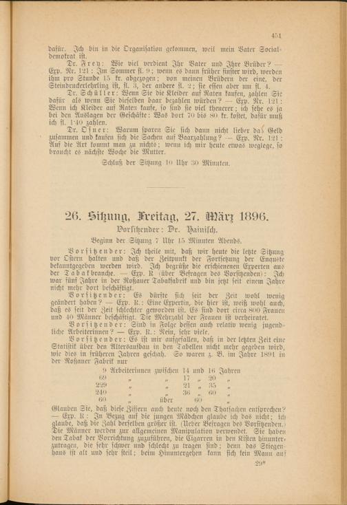 Dr. Frey: Wie viel verdient Ihr Vater nnd Ihre Bruder? — Exp. Nr. 12t : Im Sommer fl. 9; wenn es dann früher finster wird, werden ihm pro Stunde 10 kr. abgezogen; von meinen Brüdern der eine, der Steindrnckerlehrling ist, sl. 4, der andere sl. 2; sie essen aber um fl. 4.