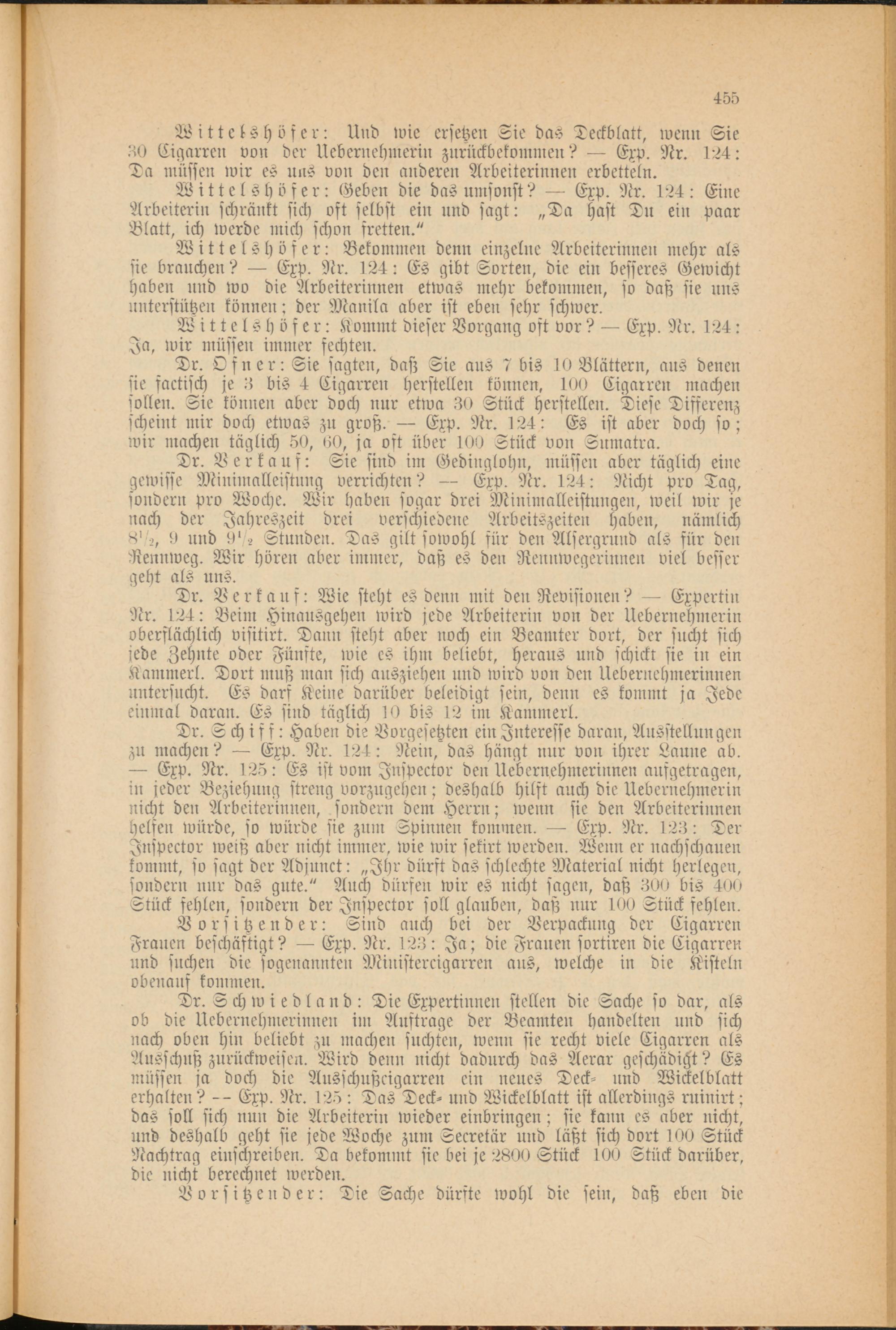 Dr. Schwiedland: Die Expertinnen stellen die Sache so dar, als ob die Uebernehmerinnen im Auftrage der Beamten handelten und sich nach oben hin beliebt zu machen suchten, wenn sie recht viele Cigarren als Ausschuß zurückweisen. Wird denn nicht dadurch das Aerar geschädigt? Es müssen ja doch die Ausschnßcigarren ein neues Deck- und Wickelblatt erhalten? -- Exp. Nr. 125 : Das Deck- und Wickelblatt ist allerdings ruinirt; das soll sich nun die Arbeiterin wieder einbringen; sie kann es aber nicht, und deshalb geht sie jede Woche zum Seeretär und läßt sich dort 100 Stück Nachtrag einschreiben. Da bekommt sie bei je 2800 Stück 100 Stück darüber, die nicht berechnet werden.