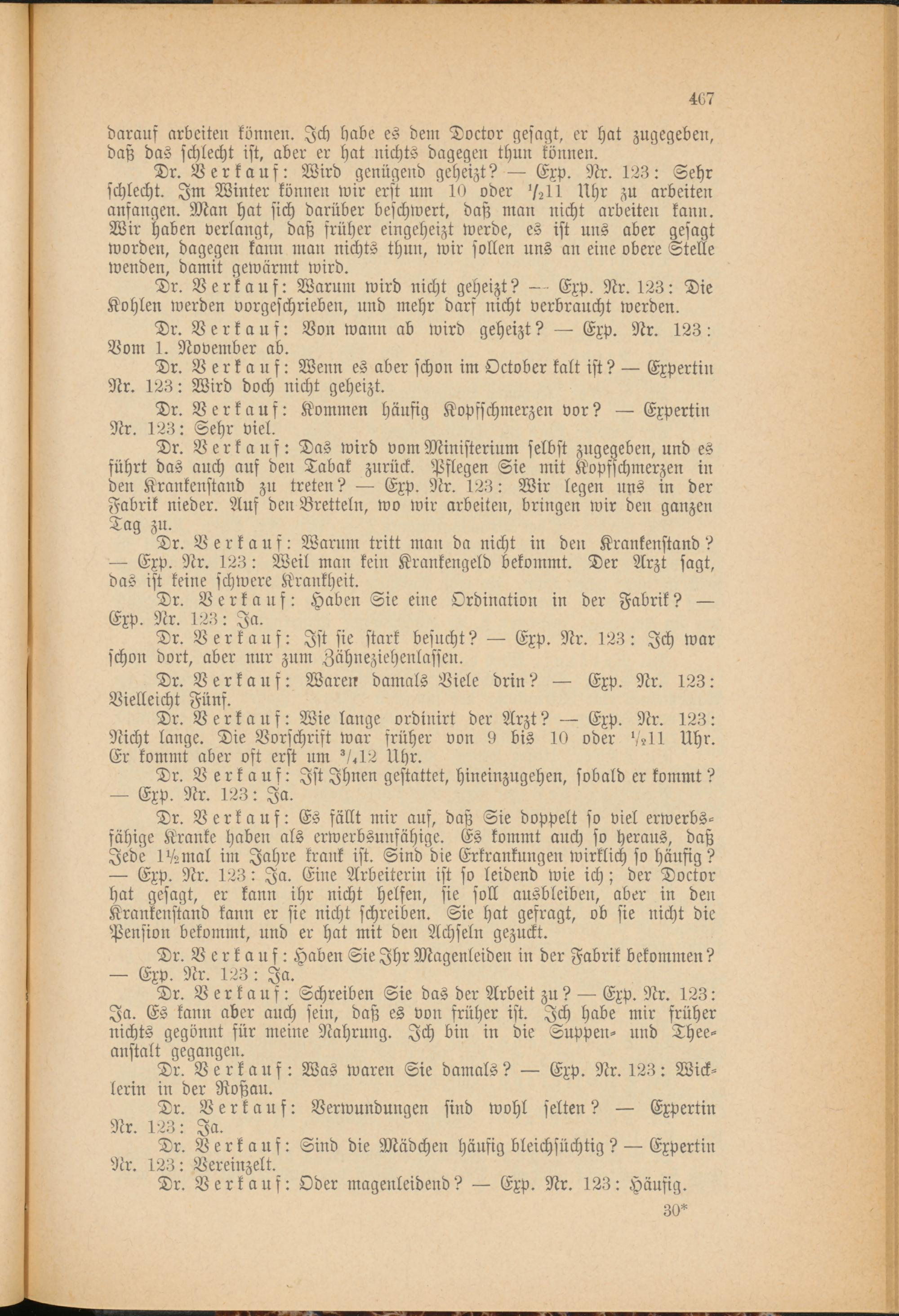 Dr. Verkauf: Das wird vom Ministerium selbst zugegeben, und es führt das auch auf den Tabak zurück. Pflegen Sie mit Kopfschmerzen in den Krankenstand zu treten? Exp. Nr. 123: Wir legen uns in der Fabrik nieder. Auf den Bretteln, wo wir arbeiten, bringen wir den ganzen Tag zu.