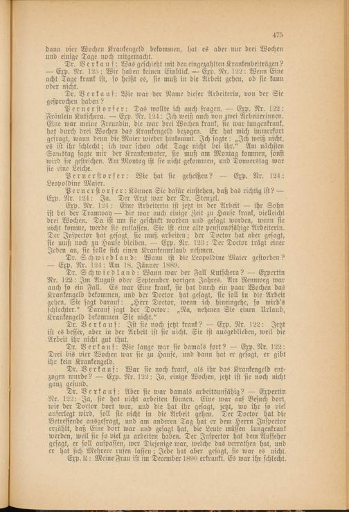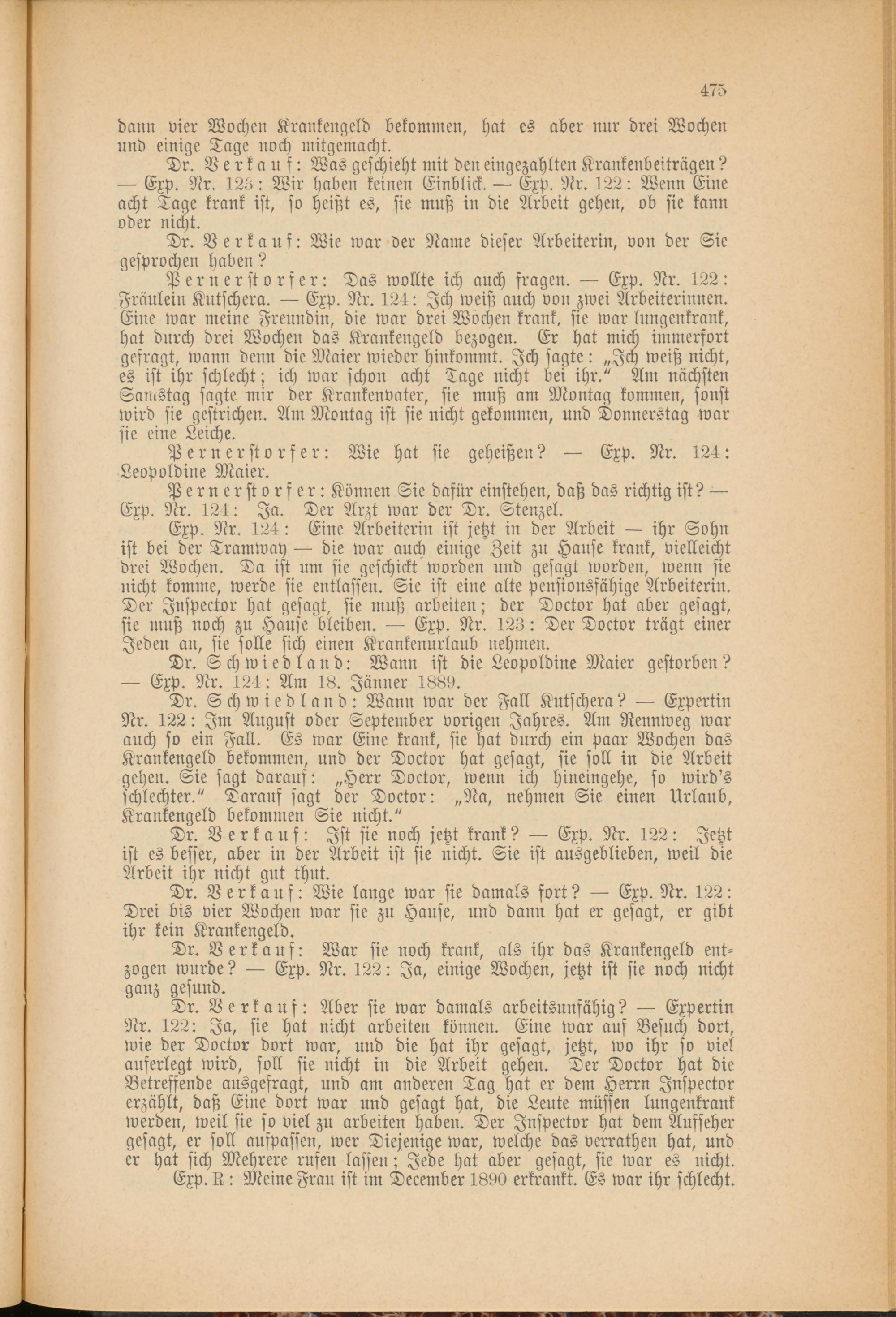 Exp. Nr. 124: Eine Arbeiterin ist jetzt in der Arbeit ihr Sohn ist bei der Tramway die war auch einige Zeit zu Hause krank, vielleicht drei Wochen. Da ist um sie geschickt worden und gesagt worden, wenn sie nicht komme, werde sie entlassen. Sie ist eine alte pensionsfähige Arbeiterin. Der Jnspector hat gesagt, sie muß arbeiten; der Doctor hat aber gesagt, sie muß noch zu Hause bleiben. Exp. Nr. 123: Der Doctor trägt einer Jeden an, sie solle sich einen Krankenurlaub nehmen.