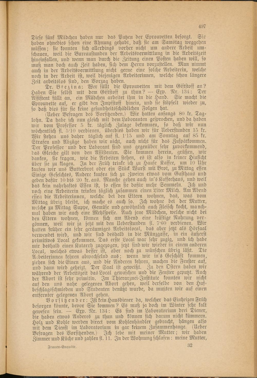 Vorsitzender: Ist kein Hausdiener da, welcher das einheizen Früh besorgen könnte, bevor Sie kommen? Es muß ja doch im Winter sehr kalt gewesen sein. — Exp. Nr. 134: Es sind im Laboratorium drei Diener, die haben etwas Anderes zu thun und können sich darum nicht kümmern. Holz und Kohle werden direct vom Kohlenhändler gebracht, hängen also mit dem Dienst im Laboratorium in gar keinem Zusammenhange. (Ueber Befragen des Vorsitzenden.) Ich lebe mit meiner Mutter; wir haben Zimmer und Küche und zahlen fl. 11. In der Wohnung schlafen: meine Mutter,