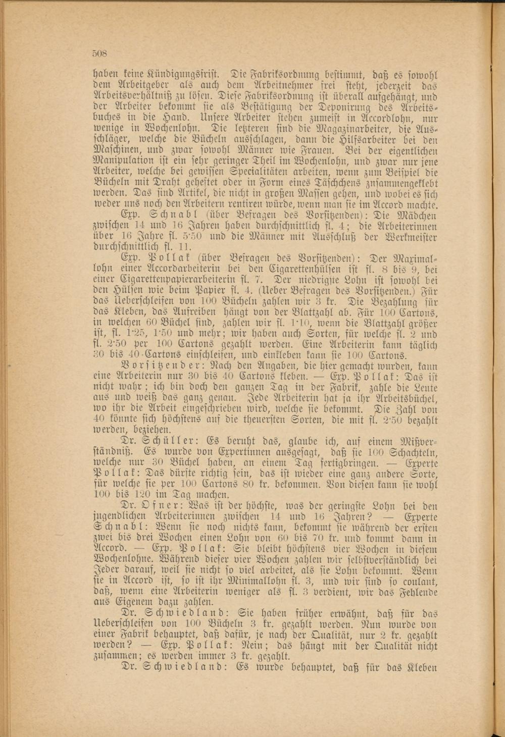 Dr. Schwiedland: Sie haben früher erwähnt, daß für das Ueberschleifen von 100 Bücheln 3 kr. gezahlt werden. Nun wurde von einer Fabrik behauptet, daß dafür, je nach der Qualität, nur 2 kr. gezahlt werden? — Exp. Pollak: Nein; das hängt mit der Qualität nicht zusammen; es werden immer 3 kr. gezahlt.