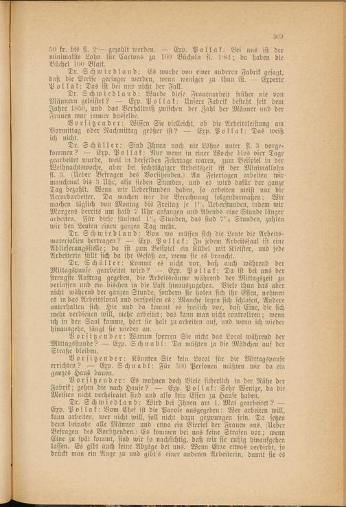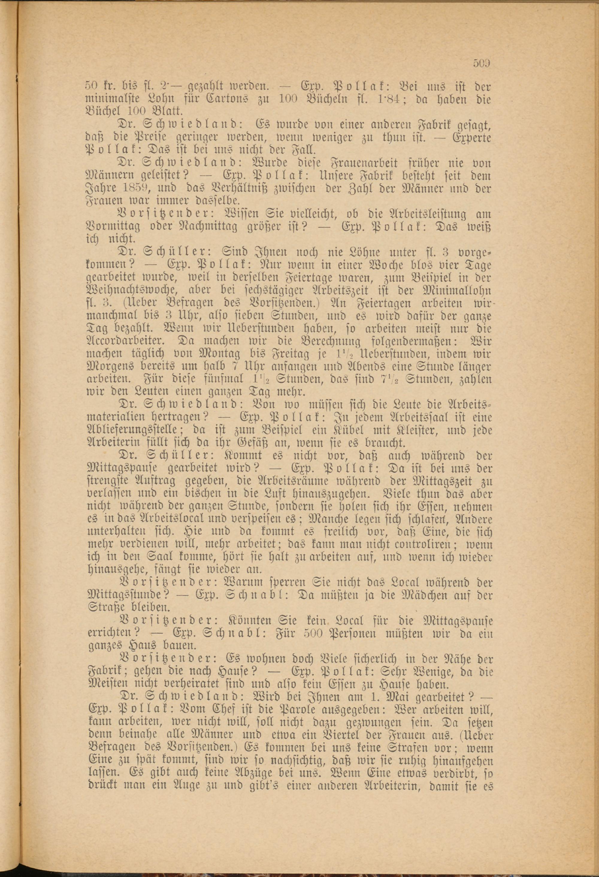 Vorsitzender: Es wohnen doch Viele sicherlich in der Nähe der Fabrik; gehen die nach Hause? — Exp. Pollak: Sehr Wenige, da die Meisten nicht verheiratet sind und also kein Essen zu Hause haben.