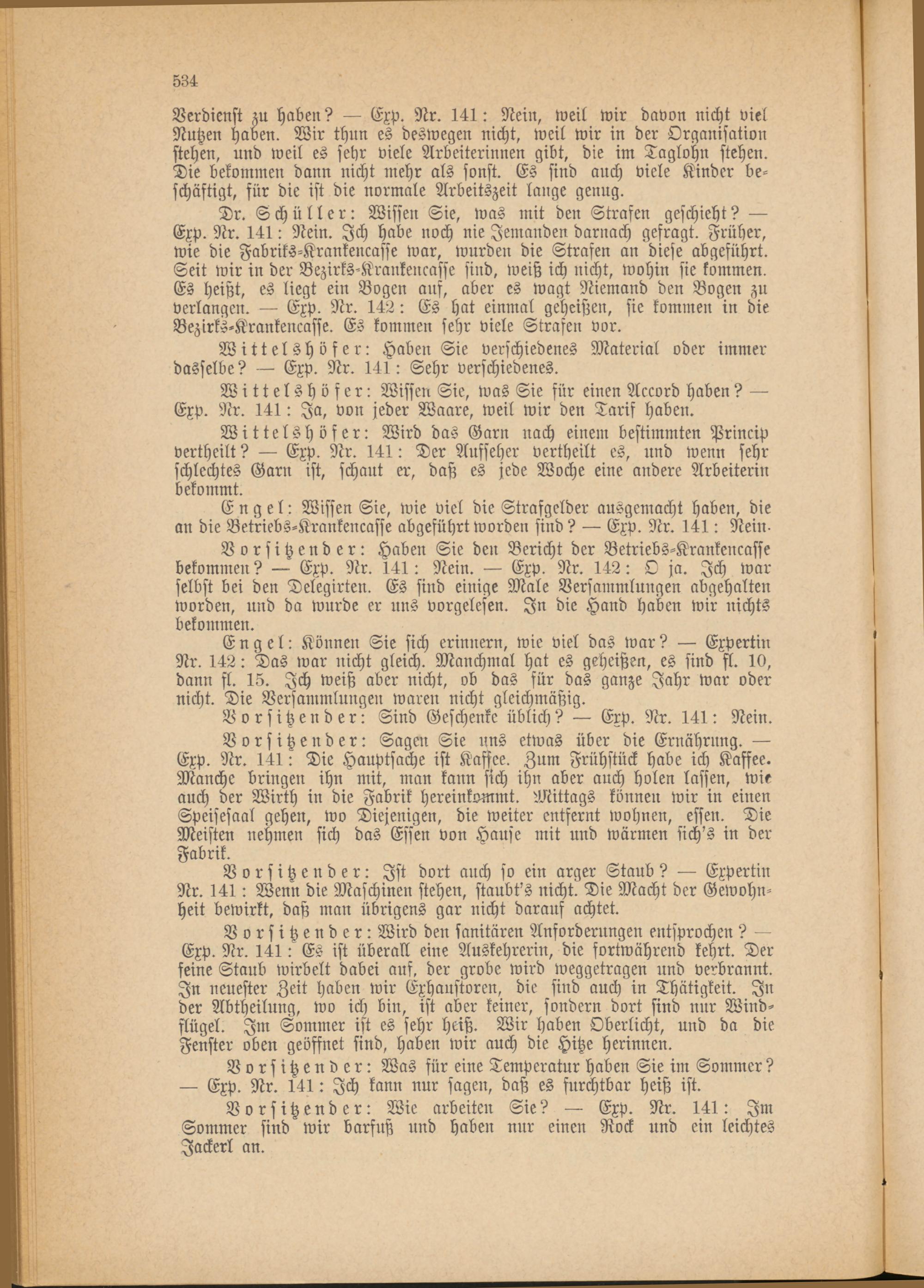 Vorsitzender: Sagen Sie uns etwas über die Ernährung. — Exp. Nr. 141: Die Hauptsache ist Kaffee. Zum Frühstück habe ich Kaffee. Manche bringen ihn mit, man kann sich ihn aber auch holen lassen, wie auch der Wirth in die Fabrik hereinkommt. Mittags können wir in einen Speisesaal gehen, wo Diejenigen, die weiter entfernt wohnen, essen. Die Meisten nehmen sich das Essen von Hause mit und wärmen sich's in der Fabrik.