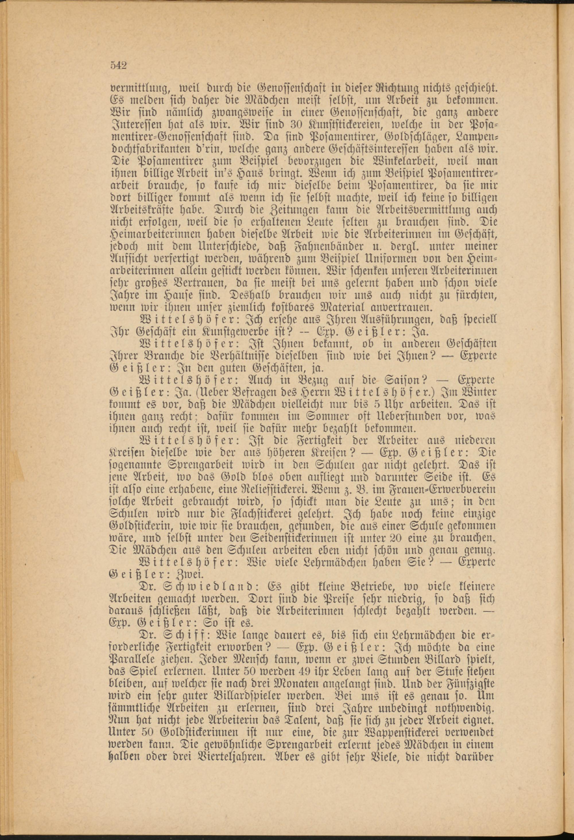 Wittelshöfer: Auch in Bezug auf die Saison? Experte Geißler: Ja. (Ueber Befragen des Herrn Wittelshöfer.) Im Winter kommt es vor, daß die Mädchen vielleicht nur bis 5 Uhr arbeiten. Das ist ihnen ganz recht; dafür kommen im Sommer oft Ueberstunden vor, was ihnen auch recht ist, weil sie dafür mehr bezahlt bekommen.