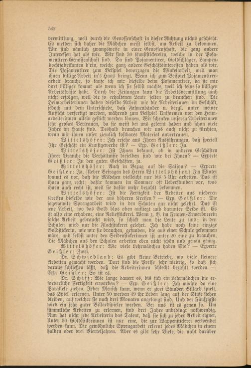 Vermittlung, weil durch die Genossenschaft in dieser Richtung nichts geschieht. Es melden sich daher die Mädchen meist selbst, um Arbeit zu bekommen. Wir sind nämlich zwangsweise in einer Genossenschaft, die ganz andere Interessen hat als wir. Wir sind 30 Kunststickereien, welche in der Posa- mentirer-Genossenschaft sind. Da sind Posamentirer, Goldschläger, Lampen- dochtfabrikanten d'rin, welche ganz andere Geschäftsinteressen haben als wir. Die Posamentirer zum Beispiel bevorzugen die Winkelarbeit, weil man ihnen billige Arbeit in's Haus bringt. Wenn ich zum Beispiel Posamentirer- arbeit brauche, so kaufe ich mir dieselbe beim Posamentirer, da sie mir dort billiger kommt als wenn ich sie selbst machte, weil ich keine so billigen Arbeitskräfte habe. Durch die Zeitungen kann die Arbeitsvermittlung auch nicht erfolgen, weil die so erhaltenen Leute selten zu brauchen sind. Die Heimarbeiterinnen haben dieselbe Arbeit wie die Arbeiterinnen im Geschäft, jedoch mit dem Unterschiede, daß Fahnenbänder u. dergl. unter meiner Aufsicht verfertigt werden, während zum Beispiel Uniformen von den Heim­arbeiterinnen allein gestickt werden können. Wir schenken unseren Arbeiterinnen sehr großes Vertrauen, da sie meist bei uns gelernt haben und schon viele Jahre im Hause sind. Deshalb brauchen wir uns auch nicht zu fürchten, wenn wir ihnen unser ziemlich kostbares Material anvertrauen.
