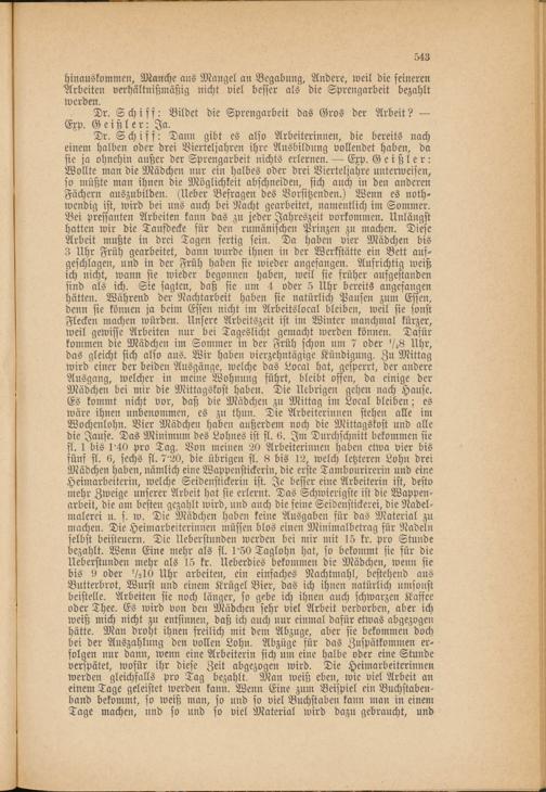 Dr. Schiff: Dann gibt es also Arbeiterinnen, die bereits nach einem halben oder drei Vierteljahren ihre Ausbildung vollendet haben, da sie ja ohnehin außer der Sprengarbeit nichts erlernen. — Exp. Geißler: Wollte man die Mädchen nur ein halbes oder drei Vierteljahre unterweisen, so müßte man ihnen die Möglichkeit abschneiden, sich auch in den anderen Fächern auszubilden. (Ueber Befragen des Vorsitzenden.) Wenn es nothwendig ist, wird bei uns auch bei Nacht gearbeitet, namentlich im Sommer. Bei pressanten Arbeiten kann das zu jeder Jahreszeit vorkommen. Unlängst hatten wir die Taufdecke für den rumänischen Prinzen zu machen. Diese Arbeit mußte in drei Tagen fertig sein. Da haben vier Mädchen bis 3 Uhr Früh gearbeitet, dann wurde ihnen in der Werkstätte ein Bett aufgeschlagen, und in der Früh haben sie wieder angefangen. Aufrichtig weiß ich nicht, wann sie wieder begonnen haben, weil sie früher aufgestanden sind als ich. Sie sagten, daß sie um 4 oder 5 Uhr bereits angefangen hätten. Während der Nachtarbeit haben sie natürlich Pausen zum Essen, denn sie können ja beim Essen nicht im Arbeitslocal bleiben, weil sie sonst Flecken machen würden. Unsere Arbeitszeit ist im Winter manchmal kürzer, weil gewisse Arbeiten nur bei Tageslicht gemacht werden können. Dafür kommen die Mädchen im Sommer in der Früh schon um 7 oder 'Z8 Uhr, das gleicht sich also aus. Wir haben vierzehntägige Kündigung. Zu Mittag wird einer der beiden Ausgänge, welche das Local hat, gesperrt, der andere Ausgang, welcher in meine Wohnung führt, bleibt offen, da einige der Mädchen bei mir die Mittagskost haben. Die Uebrigen gehen nach Hause. Es kommt nicht vor, daß die Mädchen zu Mittag im Local bleiben; es wäre ihnen unbenommen, es zu thun. Die Arbeiterinnen stehen alle im Wochenlohn. Vier Mädchen haben außerdem noch die Mittagskost und alle die Jause. Das Minimum des Lohnes ist fl. 6. Im Durchschnitt bekommen sie fl. 1 bis 1 40 pro Tag. Von meinen 20 Arbeiterinnen haben etwa vier bis fünf fl. 6, sechs fl. 7'20, die übrigen fl. 8 bis 12, welch letzteren Lohn drei Mädchen haben, nämlich eine Wappenstickerin, die erste Tambourirerin und eine Heimarbeiterin, welche Seidenstickerin ist. Je besser eine Arbeiterin ist, desto mehr Zweige unserer Arbeit hat sie erlernt. Das Schwierigste ist die Wappenarbeit, die am besten gezahlt wird, und auch die feine Seidenstickerei, die Nadelmalerei u. s. w. Die Mädchen haben keine Ausgaben für das Material zu machen. Die Heimarbeiterinnen müssen blos einen Minimalbetrag für Nadeln selbst beisteuern. Die Ueberstunden werden bei mir mit 15 kr. pro Stunde bezahlt. Wenn Eine mehr als fl. U50 Taglohn hat, so bekommt sie für die Ueberstunden mehr als 15 kr. Ueberdies bekommen die Mädchen, wenn sie bis 9 oder V 2 IO Uhr arbeiten, ein einfaches Nachtmahl, bestehend aus Butterbrot, Wurst und einem Krügel Bier, das ich ihnen natürlich umsonst beistelle. Arbeiten sie noch länger, so gebe ich ihnen auch schwarzen Kaffee oder Thee. Es wird von den Mädchen sehr viel Arbeit verdorben, aber ich weiß mich nicht zu entsinnen, daß ich auch nur einmal dafür etwas abgezogen hätte. Man droht ihnen freilich mit dem Abzüge, aber sie bekommen doch bei der Auszahlung den vollen Lohn. Abzüge für das Zuspätkommen erfolgen nur dann, wenn eine Arbeiterin sich um eine halbe oder eine Stunde verspätet, wofür ihr diese Zeit abgezogen wird. Die Heimarbeiterinnen werden gleichfalls pro Tag bezahlt. Man weiß eben, wie viel Arbeit an einem Tage geleistet werden kann. Wenn Eine zum Beispiel ein Buchstabenband bekommt, so weiß man, so und so viel Buchstaben kaun man in einem Tage machen, und so und so viel Material wird dazu gebraucht, und