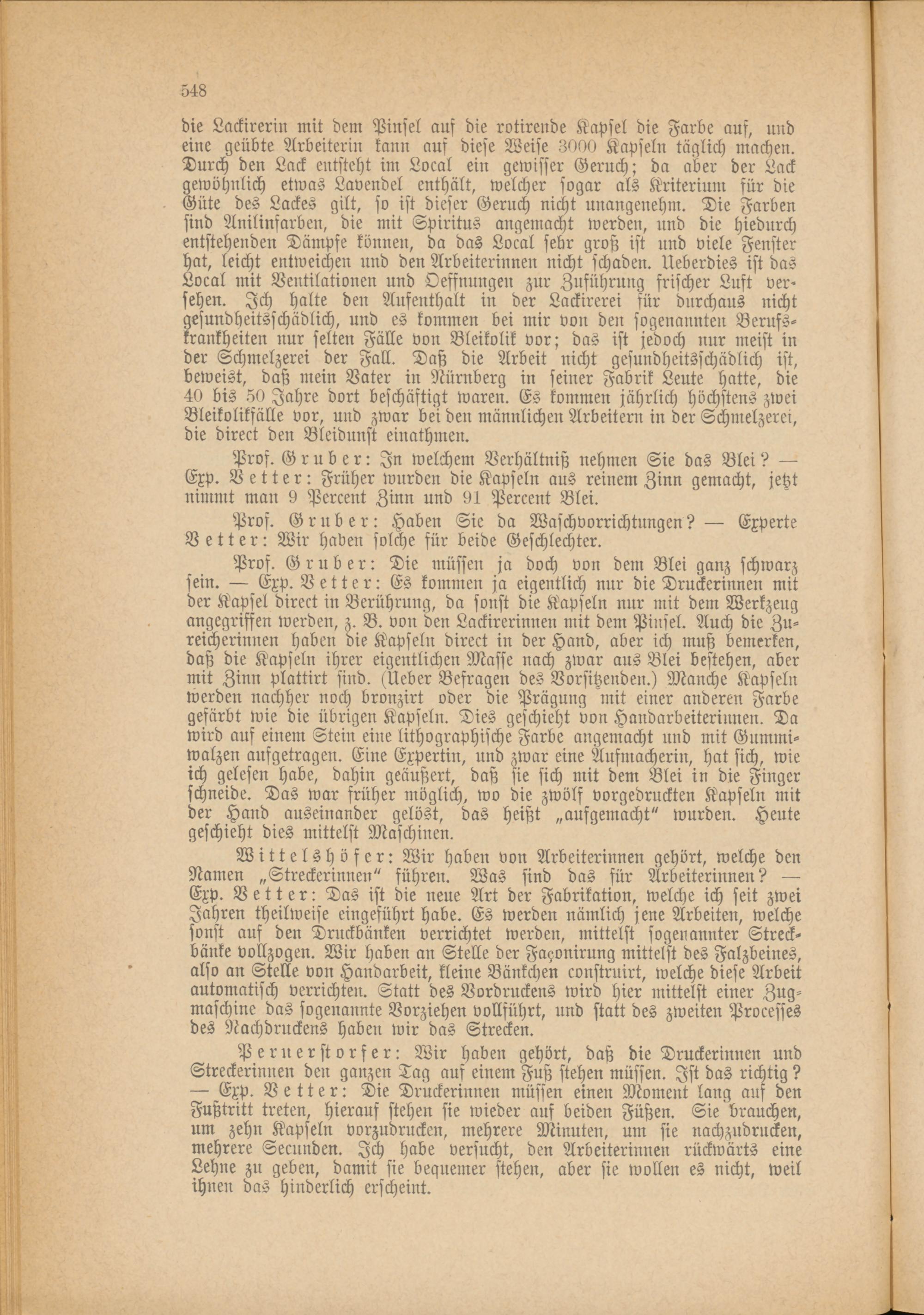Peruerstorfer: Wir haben gehört, daß die Druckerinnen und Streckerinnen den ganzen Tag auf einem Fuß stehen müssen. Ist das richtig? — Exp. Vetter: Die Druckerinnen müssen einen Moment lang auf den Fußtritt treten, hierauf stehen sie wieder auf beiden Füßen. Sie brauchen, um zehn Kapseln vorzudrucken, mehrere Minuten, um sie nachzudrucken, mehrere Secunden. Ich habe versucht, den Arbeiterinnen rückwärts eine Lehne zu geben, damit sie bequemer stehen, aber sie wollen es nicht, weil ihnen das hinderlich erscheint.