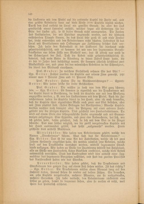 Pros. Grub er: Die müssen ja doch von dem Blei ganz schwarz sein. — Exp. Vetter: Es kommen ja eigentlich nur die Druckerinnen mit der Kapsel direct in Berührung, da sonst die Kapseln nur mit dem Werkzeug angegriffen werden, z. B. von den Lackirerinnen mit dem Pinsel. Auch die Zu- reicherinnen haben die Kapseln direct in der Hand, aber ich muß bemerken, daß die Kapseln ihrer eigentlichen Masse nach zwar aus Blei bestehen, aber mit Zinn plattirt sind. (Ueber Befragen des Vorsitzenden.) Manche Kapseln werden nachher noch bronzirt oder die Prägung mit einer anderen Farbe gefärbt wie die übrigen Kapseln. Dies geschieht von Handarbeiterinnen. Da wird auf einem Stein eine lithographische Farbe angemacht und mit Gummiwalzen aufgetragen. Eine Expertin, und zwar eine Aufmacherin, hat sich, wie ich gelesen habe, dahin geäußert, daß sie sich mit dem Blei in die Finger schneide. Das war früher möglich, wo die zwölf vorgedruckten Kapseln mit der Hand auseinander gelöst, das heißt „aufgemacht" wurden. Heute geschieht dies mittelst Maschinen.