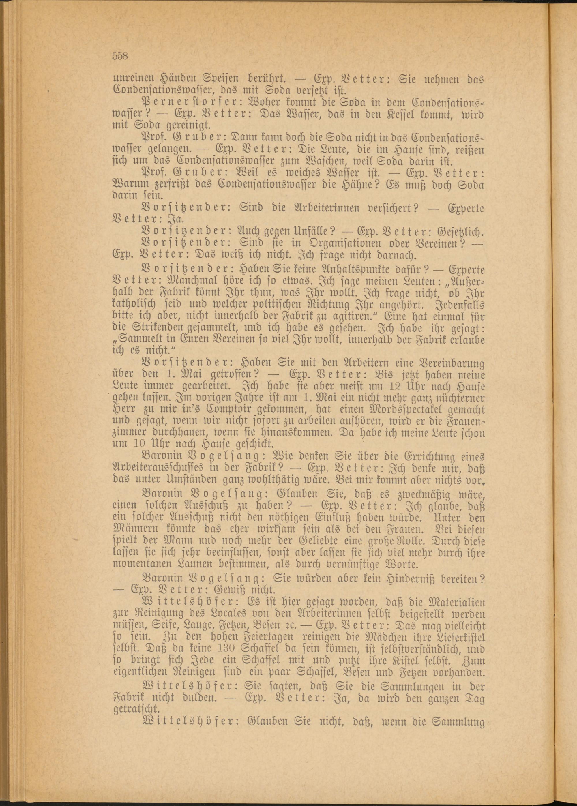 Baronin Vogelfang: Wie denken Sie über die Errichtung eines Arbeiterausschnsses in der Fabrik? — Exp. Vetter: Ich denke mir, daß das unter Umständen ganz wohlthätig wäre. Bei mir kommt aber nichts vor.