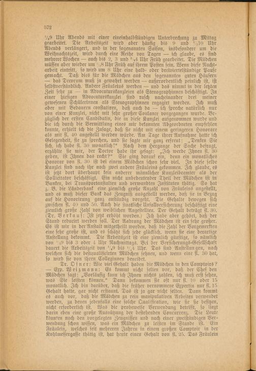 Exp. Weizmann: Es kommt nicht selten vor, daß der Chef den Mädchen sagt:Vorläufig kann ich Ihnen nichts zahlen, ich muß erst sehen, was Sie leisten können." Dann bekommen sie oft nur fl. lO oder 15 monatlich. Ich bin darüber, daß die früher vernommene Expertin nur fl. 15 Gehalt hatte, gar nicht erstaunt. Das ist ja gar nicht selten. Dann kommt es auch vor, daß die Mädchen zu rein manipnlativen Arbeiten verwendet werden, zu denen jedenfalls eine solche Qualisieation, wie sie sie besitzen, nicht erforderlich ist. Was die probeweise Verwendung betrifft, so liegt darin eben eine große Ausnütznng der bestehenden Concurrenz. Die Leute könnten nach den vorgelegten Zeugnissen und nach einer zweistündigen Ver­wendung schon wissen, was ein Mädchen zu leisten im Stande ist. Ein Fräulein, welches seit mehreren Jahren in einem großen Comptoir in der Kohlmessergasse thätig ist, hat heute einen Gehalt von sl. 25. Das Fräulein