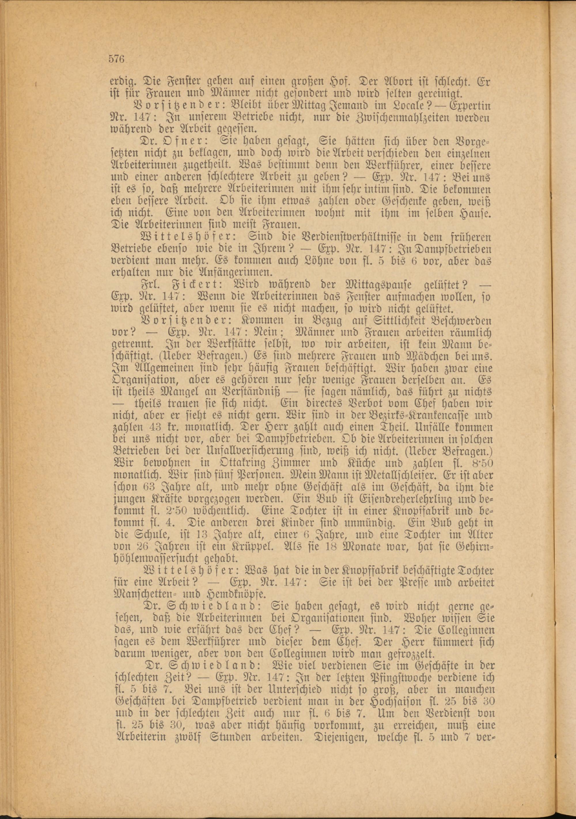 Wittelshöfer: Sind die Verdienstverhältnisse in dem früheren Betriebe ebenso wie die in Ihrem? Exp. Nr. 147: In Dampfbetrieben verdient man mehr. Es kommen auch Löhne von st. 5 bis 6 vor, aber das erhalten nur die Anfängerinnen.