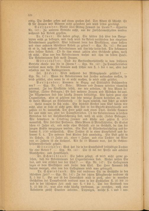Dr. Osner: Sie haben gesagt, Sie hätten sich über den Vorge­setzten nicht zu beklagen, und doch wird die Arbeit verschieden den einzelnen Arbeiterinnen zugetheilt. Was bestimmt denn den Werkführer, einer bessere und einer anderen schlechtere Arbeit zu geben? Exp. Nr. 147: Bei uns ist es so, daß mehrere Arbeiterinnen mit ihm sehr intim sind. Die bekommen eben bessere Arbeit. Ob sie ihm etwas zahlen oder Geschenke geben, weiß ich nicht. Eine von den Arbeiterinnen wohnt mit ihm im selben Hause. Die Arbeiterinnen sind meist Frauen.