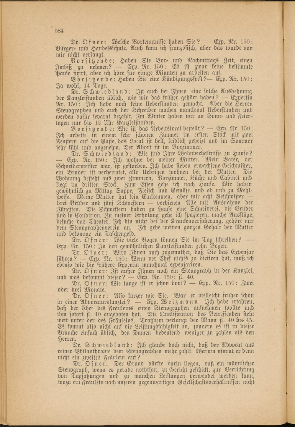 Dr. Schwiedland: Wie sind Ihre Wohnverhältnisse zu Hause? — Exp. Nr. 150: Ich wohne bei meiner Mutter. Mein Vater, der Schneidermeister war, ist gestorben. Ich habe sieben erwachsene Geschwister, ein Bruder ist verheiratet, alle Uebrigen wohnen bei der Mutter. Die Wohnung besteht aus zwei Zimmern, Vorzimmer. Küche und Cabinet und liegt im dritten Stock. Zum Essen gehe ich nach Hause. Wir haben gewöhnlich zu Mittag Suppe, Fleisch und Gemüse und ab und zu Mehlspeise. Meine Mutter hat kein Einkommen, aber wir acht Geschwister — drei Brüder und fünf Schwestern — verdienen Alle mit Ausnahme der Jüngsten. Die Schwestern haben zu Hause eine Schneiderei, die Brüder sind in Condition. Zu meiner Erholung gehe ich spazieren, mache Ausflüge, besuche das Theater. Ich bin nicht bei der Krankenversicherung, gehöre nur dem Stenographenverein an. Ich gebe meinen ganzen Gehalt der Mutter und bekomme ein Taschengeld.