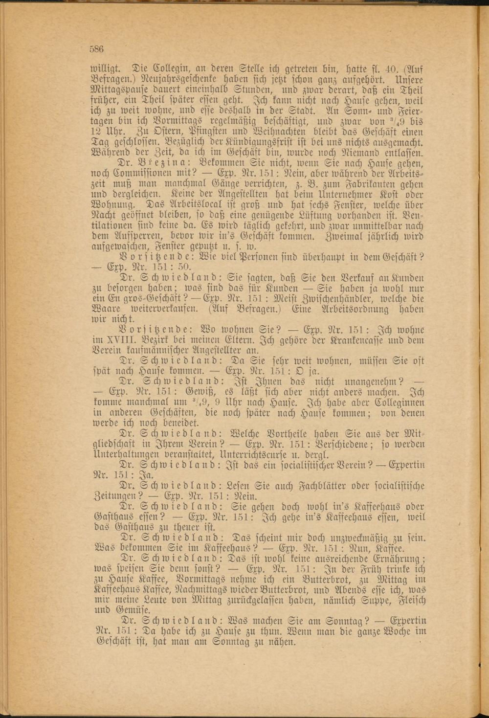 Dr. Brezina: Bekommen Sie nicht, wenn Sie nach Hause gehen, noch Commissionen mit? — Exp. Nr. 151: Nein, aber während der Arbeitszeit muß man manchmal Gänge verrichten, z. B. zum Fabrikanten gehen und dergleichen. Keine der Angestellten hat beim Unternehmer Kost oder Wohnung. Das Arbeitslocal ist groß und hat sechs Fenster, welche über Nacht geöffnet bleiben, so daß eine genügende Lüftung vorhanden ist. Ventilationen sind keine da. Es wird täglich gekehrt, und zwar unmittelbar nach dem Aufsperren, bevor wir in's Geschäft'kommen. Zweimal jährlich wird ausgewaschen, Fenster geputzt u. s. w.