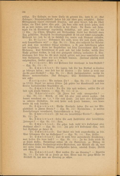 Dr. Schwiedland: Sie sagten, daß Sie den Verkauf an Kunden zu besorgen haben; was sind das für Kunden — Sie haben ja wohl nur ein En gros-Geschäft?—Exp. Nr. 151: Meist Zwischenhändler, welche die Waare weiterverkaufen. (Auf Befragen.) Eine Arbeitsordnung haben wir nicht.