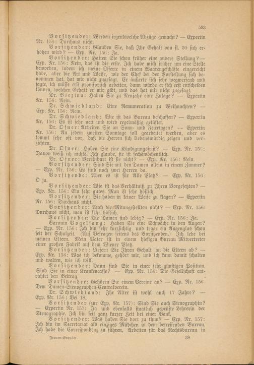 Dr. Schwiedland: Wie ist das Bureau beschaffen? — Expertin Nr. 156: Es ist sehr nett und wird regelmäßig gelüftet.
