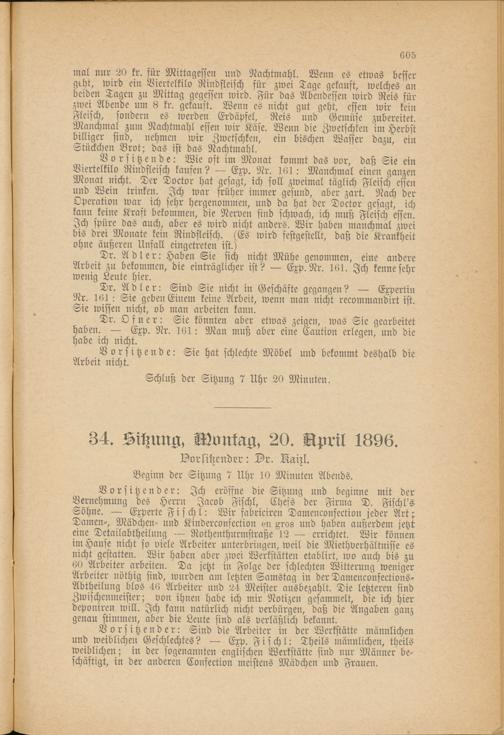 Vorsitzender: Sind die Arbeiter in der Werkstätte männlichen und weiblichen Geschlechtes? — Exp. Fischl: Theils männlichen, theils weiblichen; in der sogenannten englischen Werkstätte sind nur Männer beschäftigt, in der anderen Confection meistens Mädchen und Frauen.