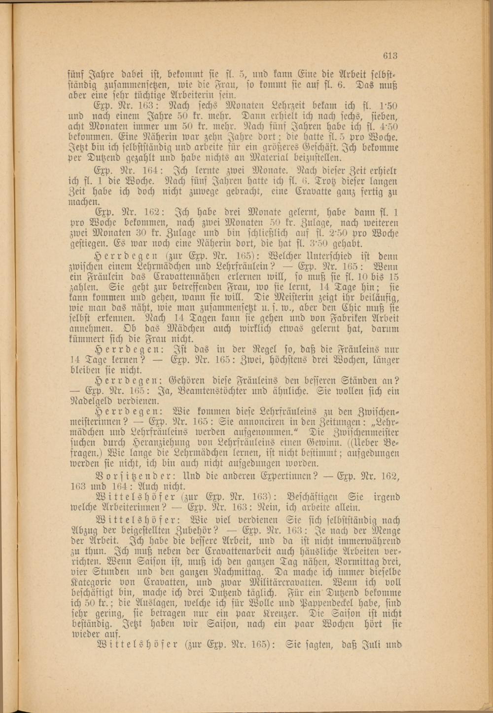 Herrdegen (zur Exp. Nr. 165): Welcher Unterschied ist denn zwischen einem Lehrmädchen und Lehrfräulein? — Exp. Nr. 165: Wenn ein Fräulein das Cravattennähen erlernen will, so muß sie fl. 10 bis 15 zahlen. Sie geht zur betreffenden Frau, wo sie lernt, 14 Tage hin; sie kann kommen und gehen, wann sie will. Die Meisterin zeigt ihr beiläufig, wie man das näht, wie man zusammensetzt u. s. w., aber den Chic muß sie selbst erkennen. Nach 14 Tagen kaun sie gehen und von Fabriken Arbeit annehmen. Ob das Mädchen auch wirklich etwas gelernt hat, darum kümmert sich die Frau nicht.