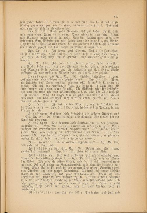 Herrdegen: Wie kommen diese Lehrfräuleins zu den Zwischen- meisterinnen? — Exp. Nr. 165: Sie annonciren in den Zeitungen: „Lehrmädchen und Lehrfräuleins werden aufgenommen." Die Zwischenmeister suchen durch Heranziehung von Lehrfräuleins einen Gewinn. ((Ueber Befragen.) Wie lange die Lehrmädchen lernen, ist nicht bestimmt; aufgedungen werden sie nicht, ich bin auch nicht aufgedungen worden.