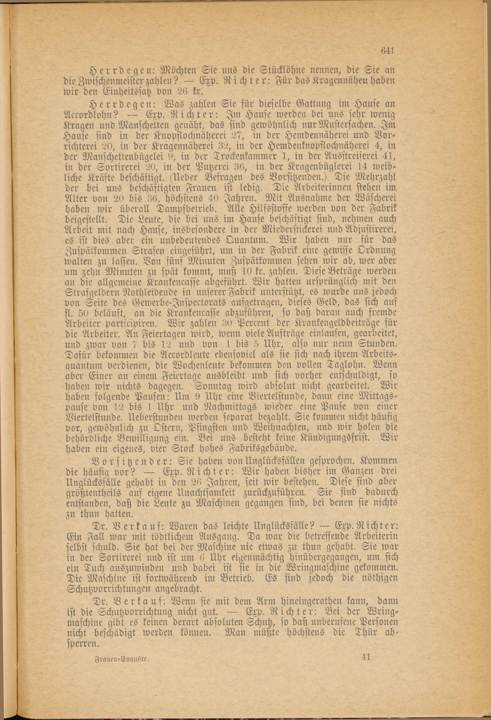 Herrdegen: Möchten Sie nns die Stücklöhne nennen, die Sie an die Zwischenmeister zahlen? — Exp. Richter: Für das Äragennähen haben wir den Einheitssatz von 26 kr.