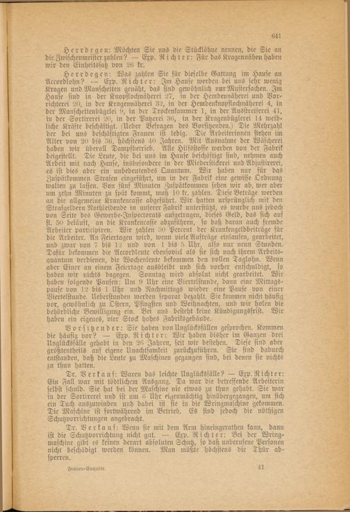 Dr. Verkauf: Waren das leichte Unglücksfälle? — Exp. Richter: Ein Fall war mit tödtlichem Ausgang. Da war die betreffende Arbeiterin selbst schuld. Sie hat bei der Maschine nie etwas zu thun gehabt. Sie war in der Sortirerei und ist um 6 Uhr eigenmächtig hinübergegangen, um sich ein Tuch auszuwinden und dabei ist sie in die Wringmaschine gekommen. Die Maschine ist fortwährend im Betrieb. Es sind jedoch die nöthigen Schutzvorrichtungen angebracht.