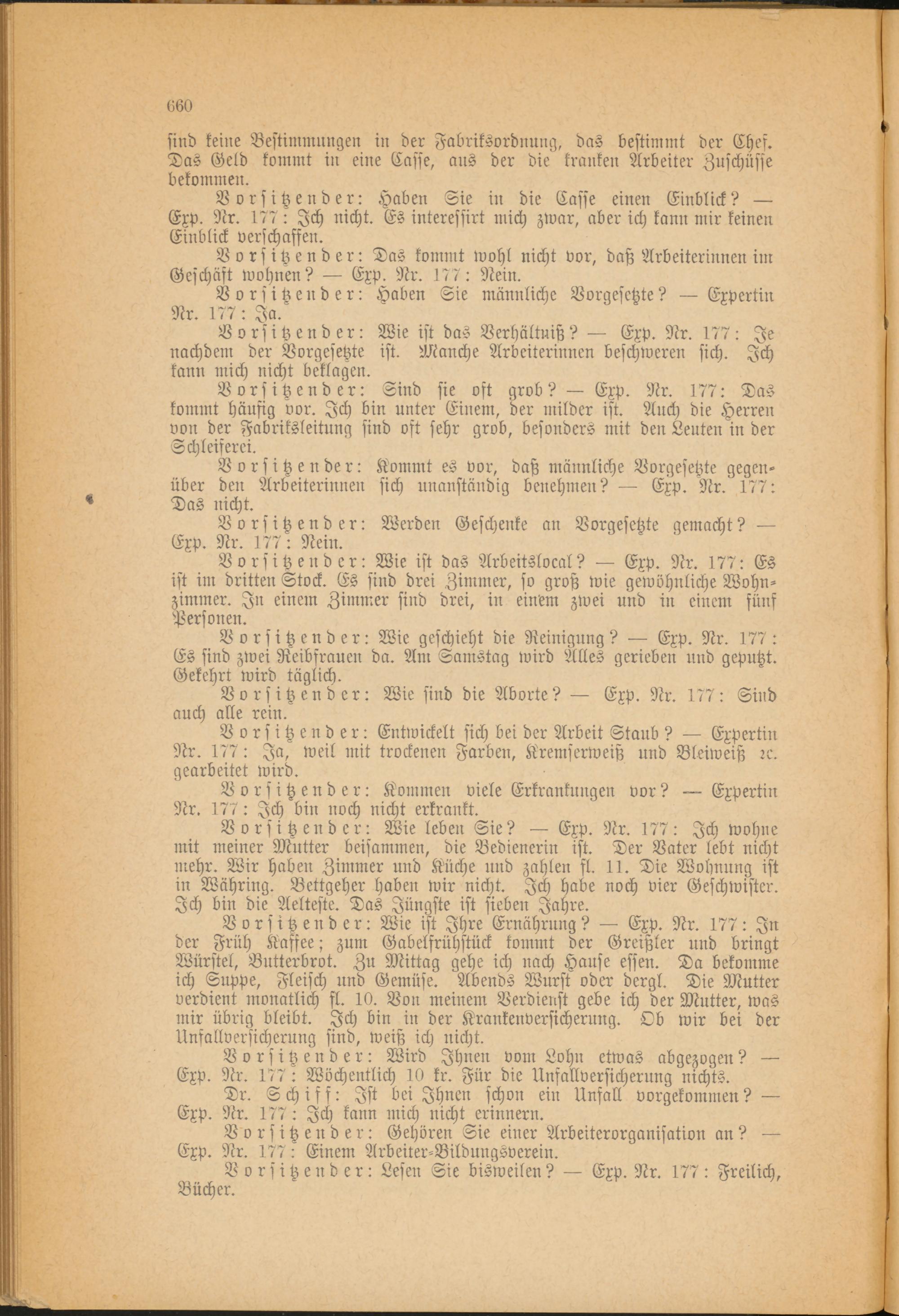 Vorsitzer: der: Wie ist Ihre Ernährung ? — Exp. Nr. 177: In der Früh Kaffee; zum Gabelfrühstück kommt der Greißler uud bringt Würstel, Butterbrot. Zu Mittag gehe ich nach Hause essen. Da bekomme ich Suppe, Fleisch und Gemüse. Abends Wurst oder dergl. Die Mutter verdient monatlich fl. 10. Von meinem Verdienst gebe ich der Mutter, was mir übrig bleibt. Ich bin in der Krankenversicherung. Ob wir bei der Unfallversicherung sind, weiß ich nicht.