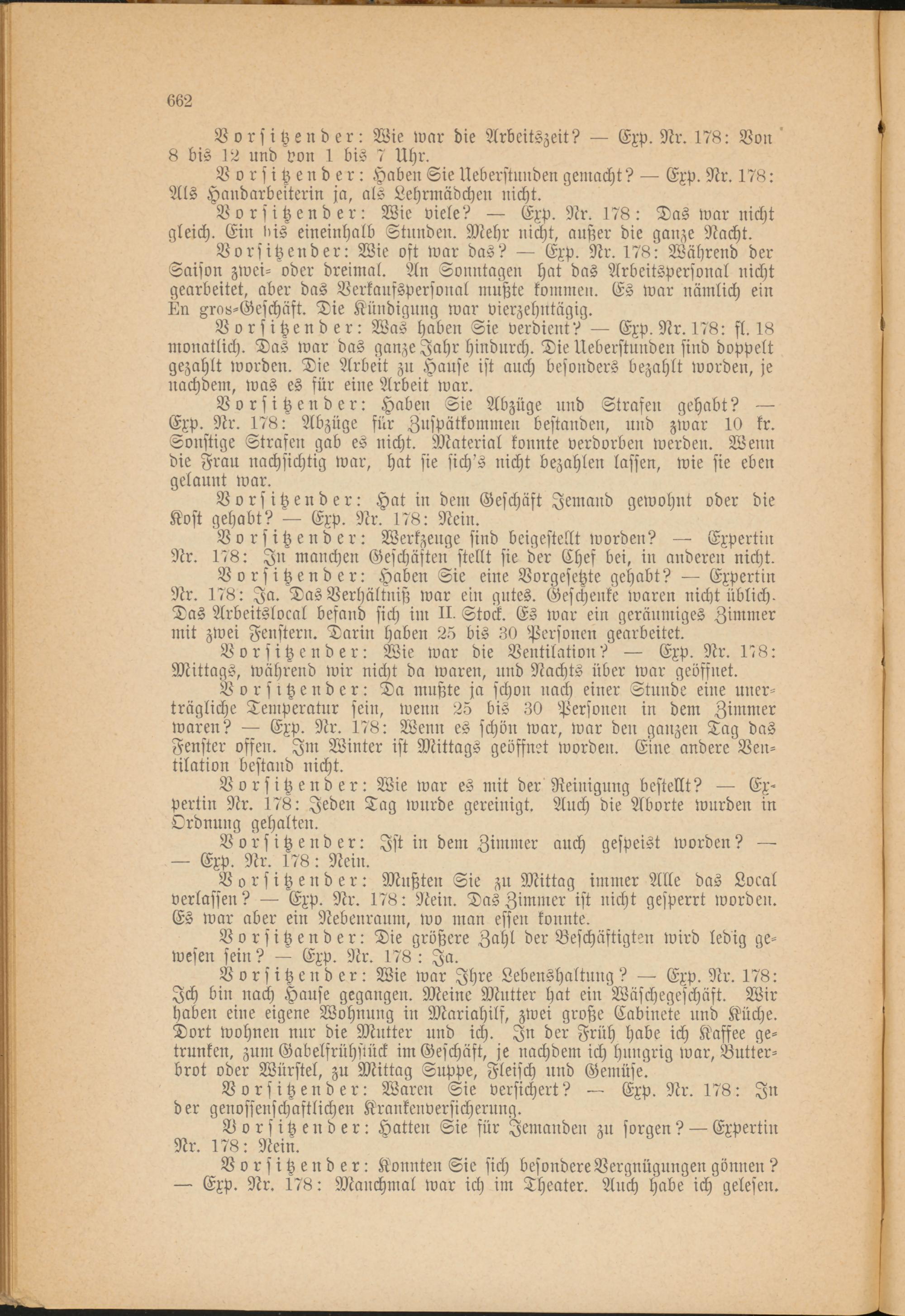 Vorsitzender: Haben Sie eine Vorgesetzte gehabt? Expertin Nr. 178: Ja. Das Verhältniß war ein gutes. Geschenke waren nicht üblich. Das Arbeitslocal befand sich im II- Stock. Es war ein geräumiges Zimmer mit zwei Fenstern. Darin haben 25 bis 30 Personen gearbeitet.