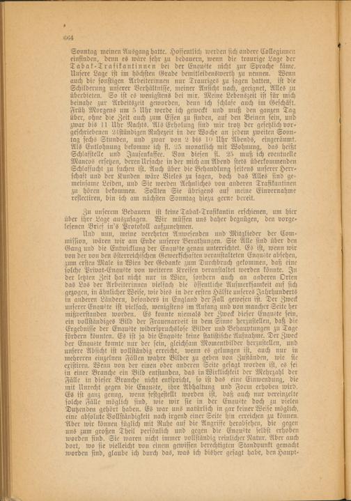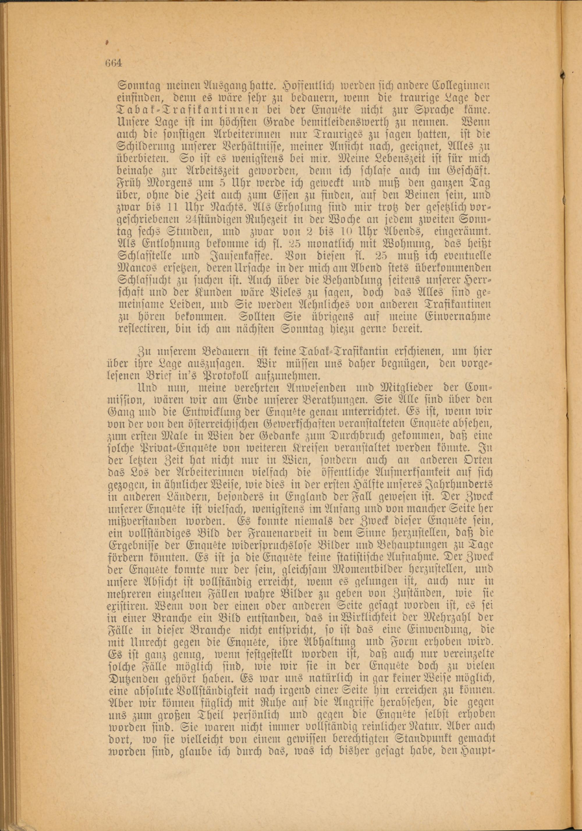 Sonntag meinen Ausgang hatte. Hoffentlich werden sich andere Colleginnen einsinden, denn es wäre sehr zu bedauern, wenn die traurige Lage der T ab ak-Trafi kautinnen bei der Enauete nicht zur Sprache käme. Unsere Lage ist im höchsten Grade bemitleidenswert!) zu nennen. Wenn auch die sonstigen Arbeiterinnen nur Trauriges zu sagen hatten, ist die Schilderung unserer Verhältnisse, meiner Ansicht nach, geeignet, Alles zu überbieten. So ist es wenigstens bei mir. Meine Lebenszeit ist für mich beinahe zur Arbeitszeit geworden, denn ich schlafe auch im Geschäft. Früh Morgens um 5 Uhr werde ich geweckt und muß den ganzen Tag über, ohne die Zeit auch zum Essen zu finden, auf den Beinen sein, und zwar bis 11 Uhr Nachts. Als Erholung sind mir trotz der gesetzlich vorgeschriebenen 24stündigen Ruhezeit in der Woche an jedem zweiten Sonntag sechs Stunden, und zwar von 2 bis 10 Uhr Abends, eingeräumt. Als Entlohnung bekomme ich fl. 25 monatlich mit Wohnung, das heißt Schlafstelle und Jausenkaffee. Von diesen fl. 25 muß ich eventuelle Mancos ersetzen, deren Ursache in der mich am Abend stets überkommenden Schlafsucht zu suchen ist. Auch über die Behandlung seitens unserer Herrschaft und der Kunden wäre Vieles zu sagen, doch das Alles sind gemeinsame Leiden, und Sie werden Aehnliches von anderen Trafikantinen zu hören bekommen. Sollten Sie übrigens auf meine Einvernahme reflectiren, bin ich am nächsten Sonntag hiezu gerne bereit.