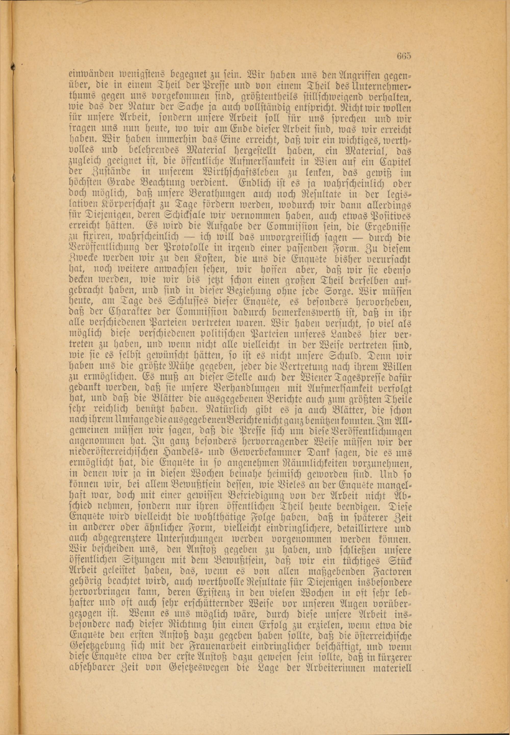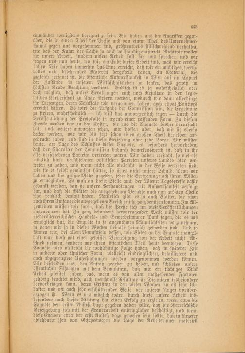einwänden wenigstens begegnet zu sein. Wir baden uns den Angriffen gegen­über, die in einem Theil der Presse und von einem Theil des Unternehmer- thums gegen uns vorgekommen sind, größteutheils stillschweigend verhalten, wie das der Natur der Sache ja auch vollständig entspricht. Nicht wir wollen für unsere Arbeit, sondern unsere Arbeit soll sür uns sprechen und wir fragen uns nun heute, wo wir am Ende dieser Arbeit sind, was wir erreicht haben. Wir haben immerhin das Eine erreicht, daß wir ein wichtiges, werth- volles und belehrendes Material hergestellt haben, ein Material, das zugleich geeignet ist, die öffentliche Aufmerksamkeit in Wien auf ein Capitel der Zustände in unserem Wirthschaftsleben zu lenken, das gewiß im höchsten Grade Beachtung verdient. Endlich ist es ja wahrscheinlich oder doch möglich, daß unsere Berathungen auch noch Resultate in der legis­lativen Körperschaft zu Tage fördern werden, wodurch wir dann allerdings für Diejenigen, deren Schicksale wir vernommen haben, auch etwas Positives erreicht hätten. Es wird die Aufgabe der Commission sein, die Ergebnisse zu fixiren, wahrscheinlich ich will das unvorgreiflich sagen durch die Veröffentlichung der Protokolle in irgend einer passenden Form. Zu diesem Zwecke werden wir zu den Kosten, die uns die Enquete bisher verursacht hat, noch weitere anwachsen sehen, wir hoffen aber, daß wir sie ebenso decken werden, wie wir bis jetzt schon einen großen Theil derselben auf­gebracht haben, und sind in dieser Beziehung ohne jede Sorge. Wir müssen heute, am Tage des Schlusses dieser Enquete, es besonders hervorheben, daß der Charakter der Commission dadurch bemerkenswerth ist, daß in ihr alle verschiedenen Parteien vertreten waren. Wir haben versucht, so viel als möglich diese verschiedenen politischen Parteien unseres Landes hier ver­treten zu haben, und wenn nicht alle vielleicht in der Weise vertreten sind, wie sie es selbst gewünscht hätten, so ist es nicht unsere Schuld. Denn wir haben uns die größte Mühe gegeben, jeder die Vertretung nach ihrem Willen zu ermöglichen. Es muß an dieser Stelle auch der HViener Tagespresse dafür gedankt werden, daß sie unsere Verhandlungen mit Aufmerksamkeit verfolgt hat, und daß die Blätter die ausgegebenen Berichte auch zum größten Theile sehr reichlich benützt haben. Natürlich gibt es ja auch Blätter, die schon nach ihrem Umfangedie ausgegebenenBerichtenichtganz benützen konnten. Im All­gemeinen müssen wir sagen, daß die Presse sich um diese Veröffentlichungen angenommen hat. In ganz besonders hervorragender Weise müssen wir der niederösterreichischen Handels- und Gewerbekammer Dank sagen, die es uns ermöglicht hat, die Enquete in so angenehmen Räumlichkeiten vorzunehmen, in denen wir ja in diesen Wochen beinahe heimisch geworden sind. Und so können wir, bei allem Bewußtsein dessen, wie Vieles an der Enquöte mangel­haft war, doch mit einer gewissen Befriedigung von der Arbeit nicht Ab- schied nehmen, sondern nur ihren öffentlichen Theil heute beendigen. Diese Enquöte wird vielleicht die wohlthätige Folge haben, daß in späterer Zeit in anderer oder ähnlicher Form, vielleicht eindringlichere, detaillirtere und auch abgegrenztere Untersuchungen werden vorgenommen werden können. Wir bescheiden uns, den Anstoß gegeben zu haben, und schließen unsere öffentlichen Sitzungen mit dem Bewußtsein, daß wir ein tüchtiges Stück Arbeit geleistet haben, das, wenn es von allen maßgebenden Factoren gehörig beachtet wird, auch werthvolle Resultate für Diejenigen insbesondere hervorbringen kann, deren Existenz in den vielen Wochen in oft sehr leb­hafter und oft auch sehr erschütternder Weise vor unseren Augen vorüber­gezogen ist. Wenn es uns möglich wäre, durch diese unsere Arbeit ins­besondere nach dieser Richtung hin einen Erfolg zu erzielen, wenn etwa die Enquete den ersten Anstoß dazu gegeben haben sollte, daß die österreichische Gesetzgebung sich mit der Frauenarbeit eindringlicher beschäftigt, und wenn diese Enquete etwa der erste Anstoß dazu gewesen sein sollte, daß in kürzerer absehbarer Zeit von Gesetzeswegen die Lage der Arbeiterinnen materiell