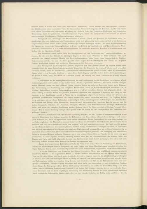 Das Absatzgebiet in Mosaikplatten umfasst, abgesehen von dem grossen Bedarf im engeren heimatlichen Industriegebiet, die ganze österreichisch-ungarische Monarchie; der Export in das Ausland könnte noch wesentlich erweitert werden, wenn die inländischen Tarifverhältnisse dementsprechend gestellt würden, selbst der überseeische Export wäre — wie Versuche bewiesen — unter dieser Vorbedingung möglich; indess bieten die Regieniederlagen der Firma in Wien, Prag und Brünn an Aufträgen genug, um vorerst von einem überseeischen Export absehen zu können.