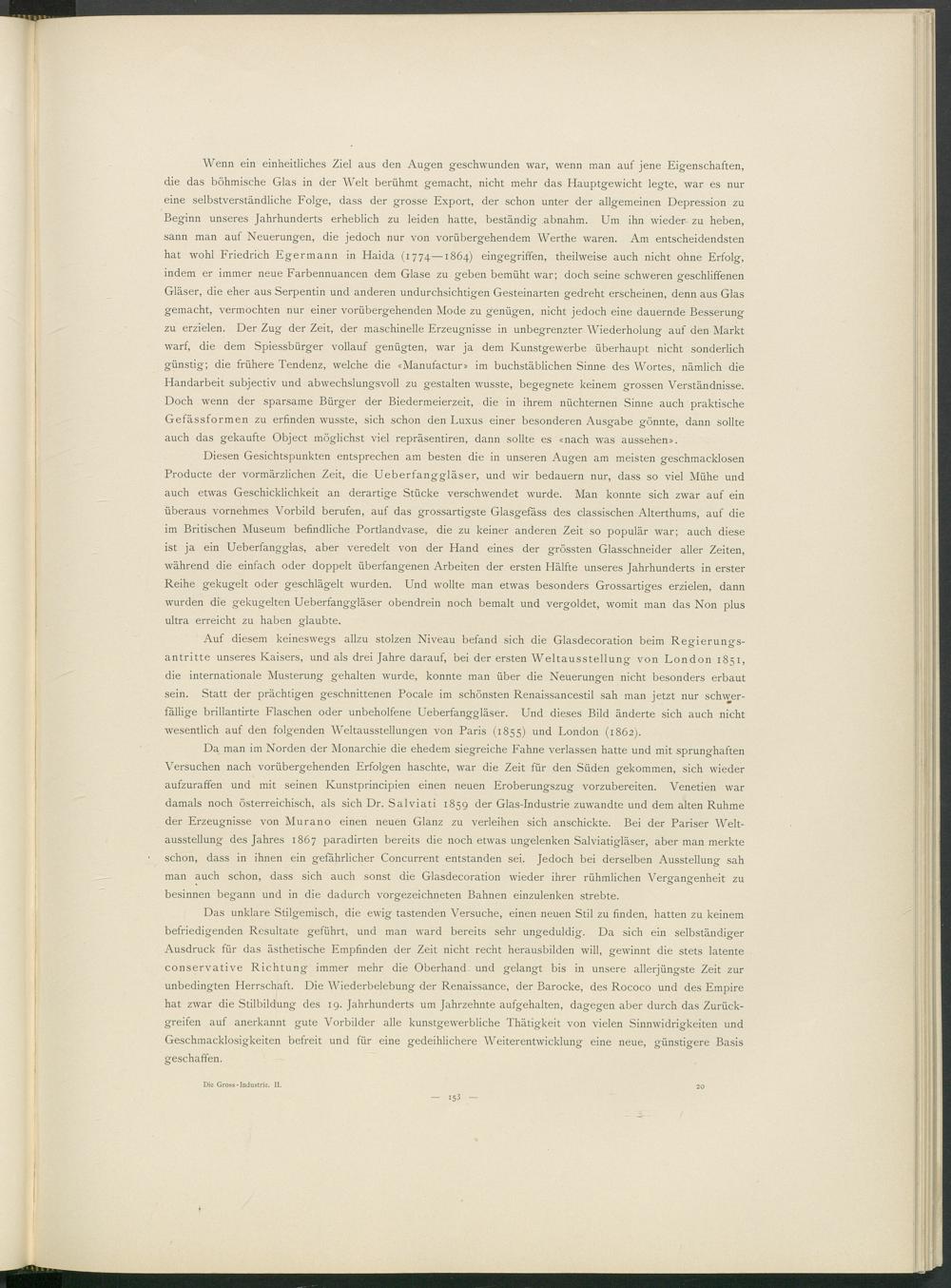 Wenn ein einheitliches Ziel aus den Augen geschwunden war, wenn man auf jene Eigenschaften, die das böhmische Glas in der Welt berühmt gemacht, nicht mehr das Hauptgewicht legte, war es nur eine selbstverständliche Folge, dass der grosse Export, der schon unter der allgemeinen Depression zu Beginn unseres Jahrhunderts erheblich zu leiden hatte, beständig abnahm. Um ihn wieder zu heben, sann man auf Neuerungen, die jedoch nur von vorübergehendem Werthe waren. Am entscheidendsten hat wohl Friedrich Egermann in Haida (1774—1864) eingegriffen, theilweise auch nicht ohne Erfolg, indem er immer neue Farbennuancen dem Glase zu geben bemüht war; doch seine schweren geschliffenen Gläser, die eher aus Serpentin und anderen undurchsichtigen Gesteinarten gedreht erscheinen, denn aus Glas gemacht, vermochten nur einer vorübergehenden Mode zu genügen, nicht jedoch eine dauernde Besserung zu erzielen. Der Zug der Zeit, der maschinelle Erzeugnisse in unbegrenzter Wiederholung auf den Markt warf, die dem Spiessbürger vollauf genügten, war ja dem Kunstgewerbe überhaupt nicht sonderlich günstig; die frühere Tendenz, welche die «Manufactur» im buchstäblichen Sinne des Wortes, nämlich die Handarbeit subjectiv und abwechslungsvoll zu gestalten wusste, begegnete keinem grossen Verständnisse. Doch wenn der sparsame Bürger der Biedermeierzeit, die in ihrem nüchternen Sinne auch praktische Gefässformen zu erfinden wusste, sich schon den Luxus einer besonderen Ausgabe gönnte, dann sollte auch das gekaufte Object möglichst viel repräsentiren, dann sollte es «nach was aussehen».