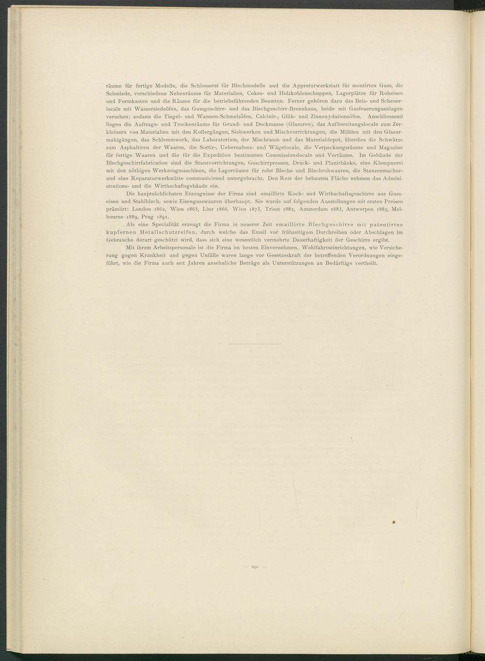 räume für fertige Modelle, die Schlosserei für Blechmodelle und die Appreturwerkstatt für montirten Guss, die Schmiede, verschiedene Nebenräume für Materialien, Cokes- und Holzkohlenschuppen, Lagerplätze für Roheisen und Formkasten und die Räume für die betriebsführenden Beamten. Ferner gehören dazu das Beiz- und Scheuerlocale mit Wassersiedeöfen, das Gussgeschirr- und das Blechgeschirr-Brennhaus, beide mit Gasfeuerungsanlagen versehen; sodann die Tiegel- und Wannen-Schmelzöfen, Calcinir-, Glüh- und Zinnoxydationsöfen. Anschliessend liegen die Auftrags- und Trockenräume für Grund- und Deckmasse (Glasuren), das Aufbereitungslocale zum Zerkleinern von Materialien mit den Kollergängen, Siebwerken und Mischvorrichtungen, die Mühlen mit den Glasurmahlgängen, das Schlemmwerk, das Laboratorium, der Mischraum und das Materialdepot, überdies die Schwärze zum Asphaltiren der Waaren, die Sortir-, Uebernahms- und Wägelocale, die Verpackungsräume und Magazine für fertige Waaren und die für die Expedition bestimmten Commissionslocale und Vorräume. Im Gebäude der Blechgeschirrfabrication sind die Stanzvorrichtungen, Geschirrpressen, Druck- und Planirbänke, eine Klempnerei mit den nöthigen Werkzeugmaschinen, die Lagerräume für rohe Bleche und Blechrohwaaren, die Stanzenmacherund eine Reparaturwerkstätte communicirend untergebracht. Den Rest der bebauten Fläche nehmen das Administrations- und die Wirthschaftsgebäude ein.
