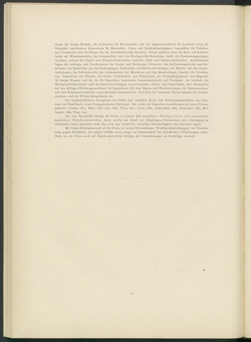 Mit ihrem Arbeitspersonale ist die Firma im besten Einvernehmen. Wohlfahrtseinrichtungen, wie Versiche- rung gegen Krankheit und gegen Unfälle waren lange vor Gesetzeskraft der betreffenden Verordnungen eingeführt, wie die Firma auch seit Jahren ansehnliche Beträge als Unterstützungen an Bedürftige vertheilt.
