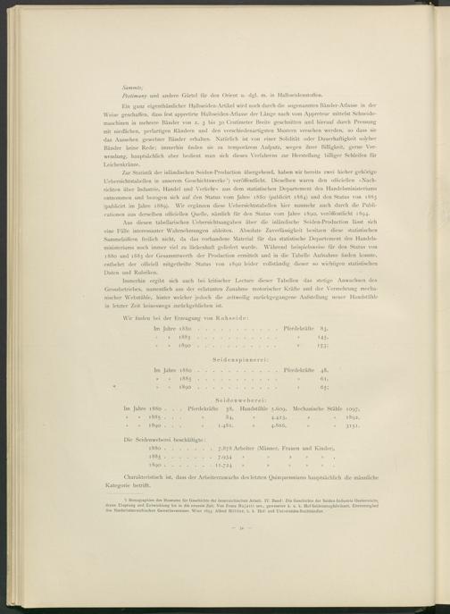 Zur Statistik der inländischen Seiden-Production übergehend, haben wir bereits zwei hieher gehörige Uebersichtstabellen in unserem Geschichtswerke 1 ) veröffentlicht. Dieselben waren den officiellen »Nachrichten über Industrie, Handel und Verkehr« aus dem statistischen Departement des Handelsministeriums entnommen und bezogen sich auf den Status vom Jahre 1880 (publicirt 1884) und den Status von 1885 (publicirt im Jahre 1889). Whr ergänzen diese Uebersichtstabellen hier nunmehr auch durch die Publi- cationen aus derselben officiellen Quelle, nämlich für den Status vom Jahre 1890, veröffentlicht 1894.