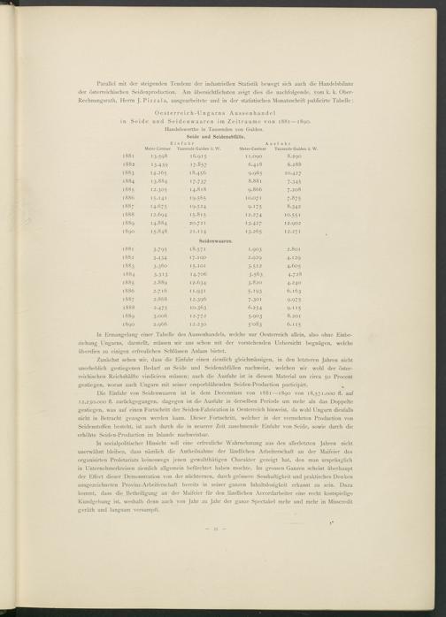 Die Einfuhr von Seidenwaaren ist in dem Decennium von 1881 —1890 von 18,571.000 fl. auf 12,230.000 fl. zurückgegangen, dagegen ist die Ausfuhr in derselben Periode um mehr als das Doppelte gestiegen, was auf einen Fortschritt der Seiden-Fabrication in Oesterreich hinweist, da wohl Ungarn diesfalls nicht in Betracht gezogen werden kann. Dieser Fortschritt, welcher in der vermehrten Production von Seidenstoffen besteht, ist auch durch die in neuerer Zeit zunehmende Einfuhr von Seide, sowie durch die erhöhte Seiden-Production im Inlande nachweisbar.