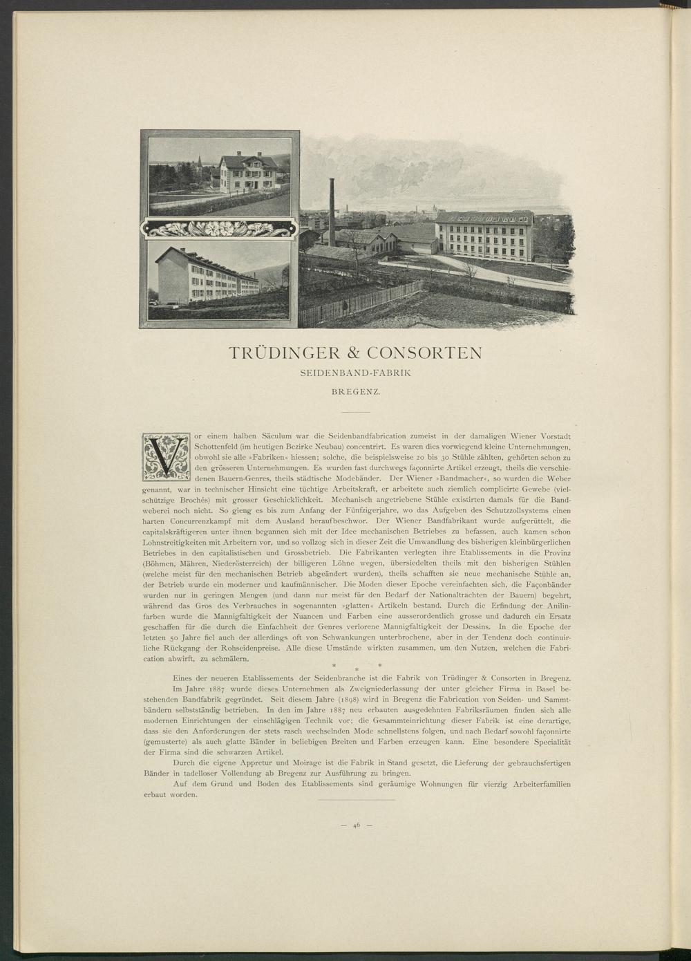 Im Jahre 1887 wurde dieses Unternehmen als Zweigniederlassung der unter gleicher Firma in Basel bestehenden Bandfabrik gegründet. Seit diesem Jahre (1898) wird in Bregenz die Fabrication von Seiden- und Sammt- bändern selbstständig betrieben. In den im Jahre 1887 neu erbauten ausgedehnten Fabriksräumen finden sich alle modernen Einrichtungen der einschlägigen Technik vor; die Gesammteinrichtung dieser Fabrik ist eine derartige, dass sie den Anforderungen der stets rasch wechselnden Mode schnellstens folgen, und nach Bedarf sowohl façonnirte (gemusterte) als auch glatte Bänder in beliebigen Breiten und Farben erzeugen kann. Eine besondere Specialität der Firma sind die schwarzen Artikel.