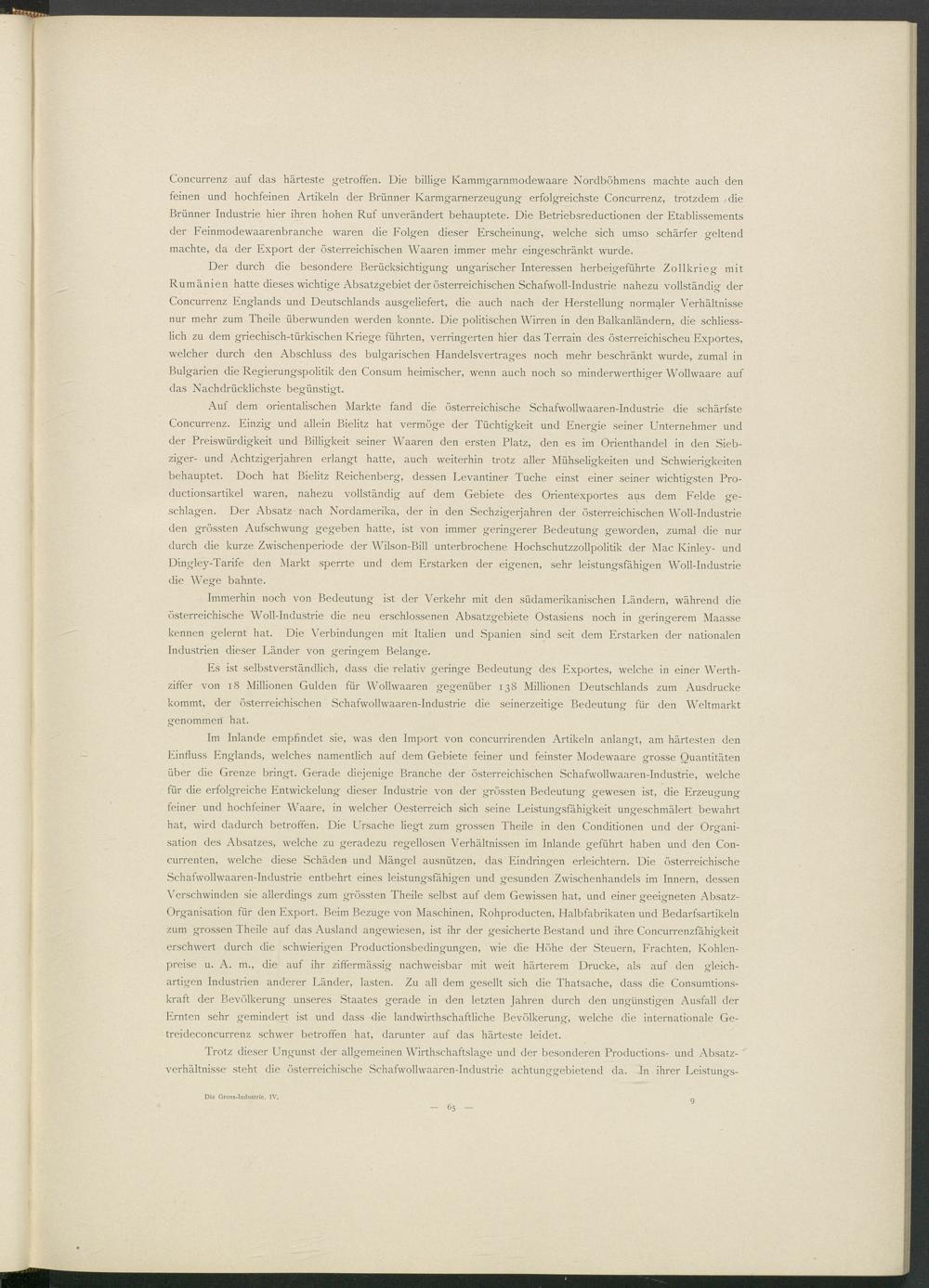 Es ist selbstverständlich, dass die relativ geringe Bedeutung des Exportes, welche in einer Werthziffer von 18 Millionen Gulden für Wollwaaren gegenüber 138 Millionen Deutschlands zum Ausdrucke kommt, der österreichischen Schafwollwaaren-Industrie die seinerzeitige Bedeutung für den Weltmarkt genommen hat.
