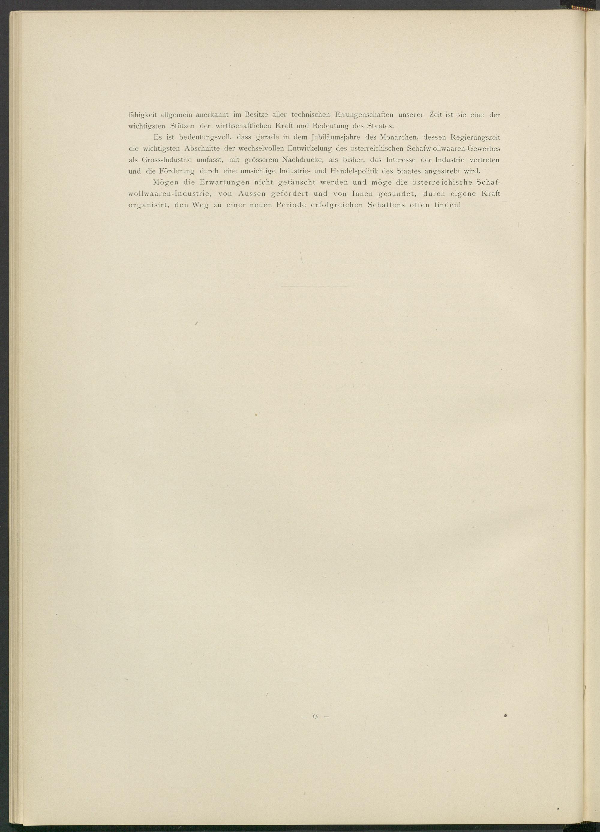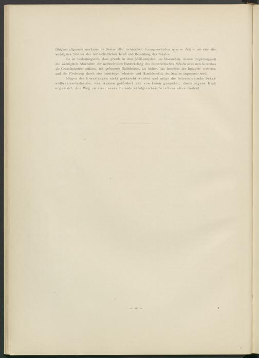 Es ist bedeutungsvoll, dass gerade in dem Jubiläumsjahre des Monarchen, dessen Regierungszeit die wichtigsten Abschnitte der wechselvollen Entwickelung des österreichischen Schafw ollwaaren-Gewerbes als Gross-Industrie umfasst, mit grösserem Nachdrucke, als bisher, das Interesse der Industrie vertreten und die Förderung durch eine umsichtige Industrie- und Handelspolitik des Staates angestrebt wird.