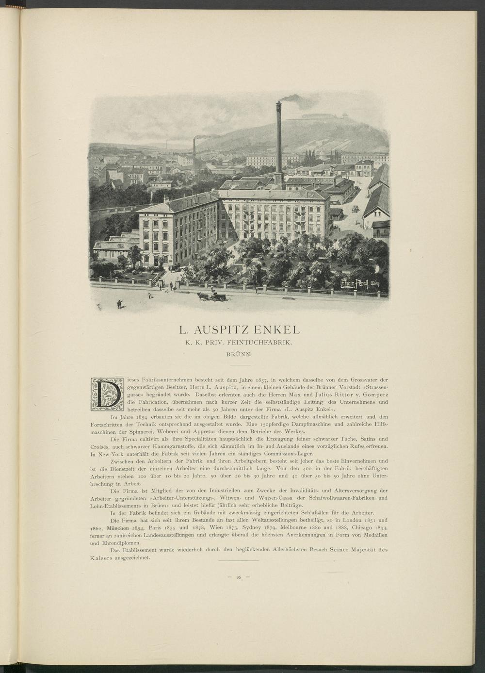 ieses Fabriksunternehmen besteht seit dem Jahre 1837, i n welchem dasselbe von dem Grossvater der gegenwärtigen Besitzer, Herrn L. Auspitz, in einem kleinen Gebäude der Brünner Vorstadt »Strassengasse« begründet wurde. Daselbst erlernten auch die Herren Max und Julius Ritter v. Gomperz die Fabrication, übernahmen nach kurzer Zeit die selbstständige Leitung des Unternehmens und betreiben dasselbe seit mehr als 50 Jahren unter der Firma »L. Auspitz Enkel«.