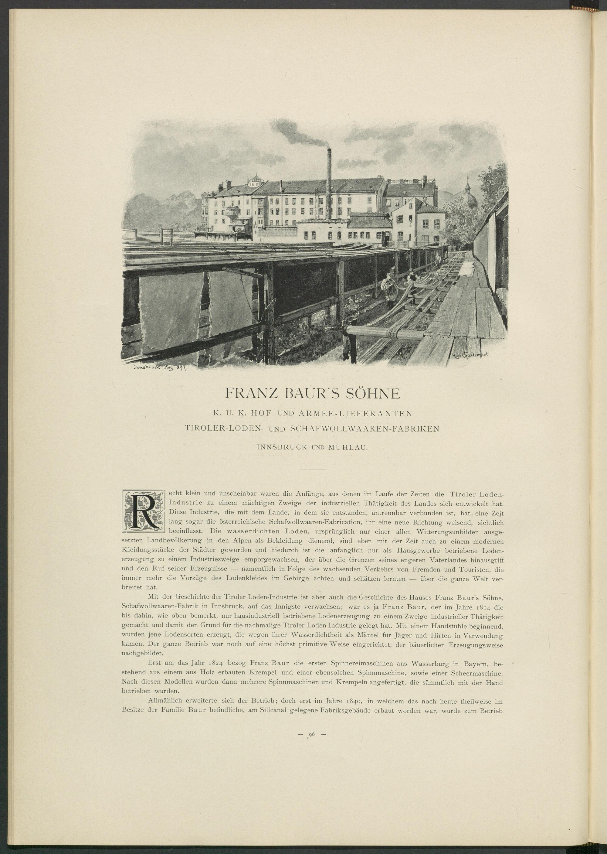 Mit der Geschichte der Tiroler Loden-Industrie ist aber auch die Geschichte des Hauses Franz Baur’s Söhne, Schafwollwaaren-Fabrik in Innsbruck, auf das Innigste verwachsen; war es ja Franz Baur, der im Jahre 1814 die bis dahin, wie oben bemerkt, nur hausindustriell betriebene Lodenerzeugung zu einem Zweige industrieller Thätigkeit gemacht und damit den Grund für die nachmalige Tiroler Loden-Industrie gelegt hat. Mit einem Handstuhle beginnend, wurden jene Lodensorten erzeugt, die wegen ihrer Wasserdichtheit als Mäntel für Jäger und Hirten in Verwendung kamen. Der ganze Betrieb war noch auf eine höchst primitive Weise eingerichtet, der bäuerlichen Erzeugungsweise nachgebildet.