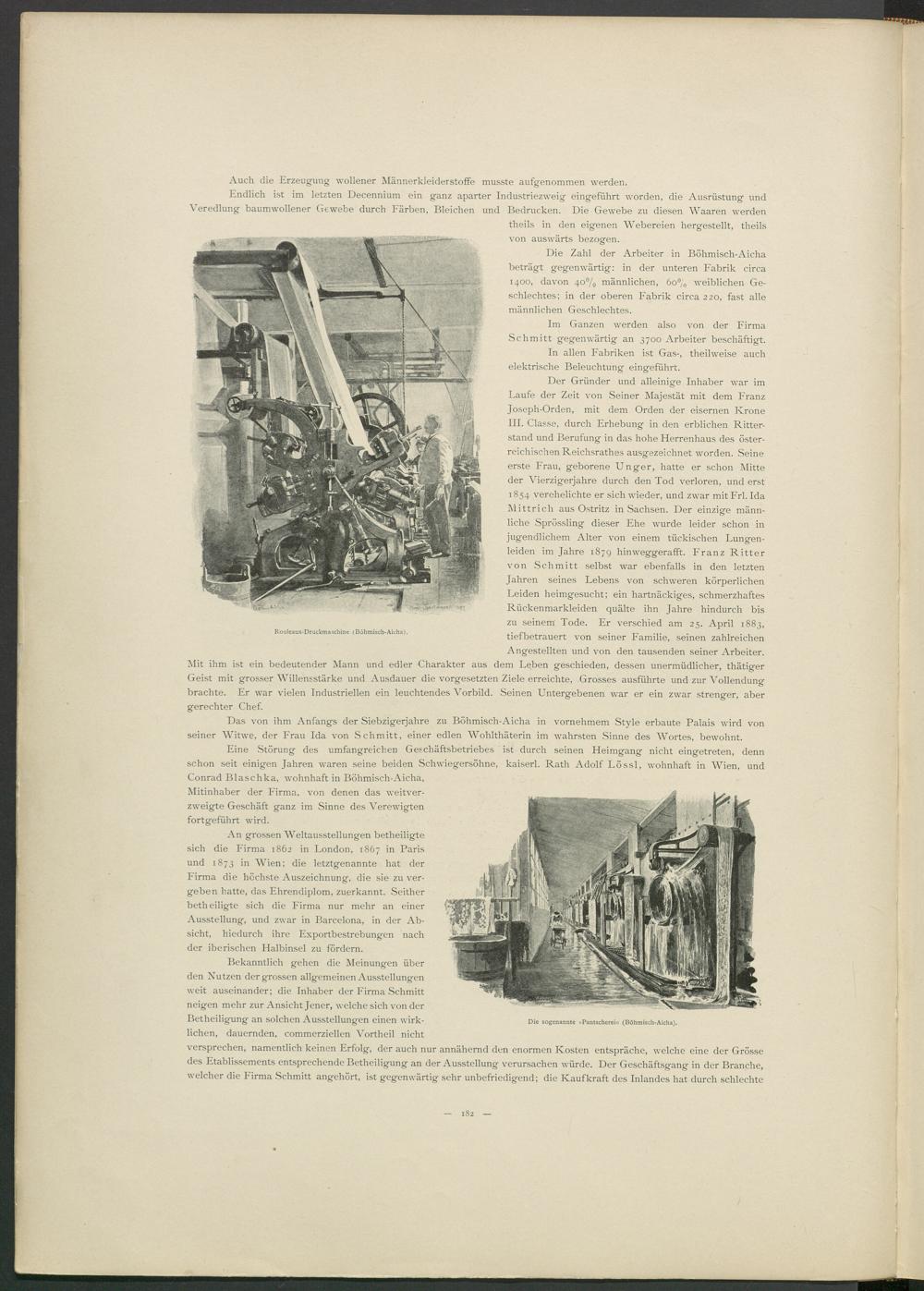 Der Gründer und alleinige Inhaber war im Laufe der Zeit von Seiner Majestät mit dem Franz Joseph-Orden, mit dem Orden der eisernen Krone III. Classe, durch Erhebung in den erblichen Ritterstand und Berufung in das hohe Herrenhaus des österreichischen Reichsrathes ausgezeichnet worden. Seine erste Frau, geborene Unger, hatte er schon Mitte der Vierzigerjahre durch den Tod verloren, und erst 1854 verehelichte er sich wieder, und zwar mitFrl. Ida Mittrich aus Ostritz in Sachsen. Der einzige männliche Sprössling dieser Ehe wurde leider schon in jugendlichem Alter von einem tückischen Lungenleiden im Jahre 1879 hinweggerafft. Franz Ritter von Schmitt selbst war ebenfalls in den letzten Jahren seines Lebens von schweren körperlichen Leiden heimgesucht; ein hartnäckiges, schmerzhaftes Rückenmarkleiden quälte ihn Jahre hindurch bis zu seinem Tode. Er verschied am 25. April 1883, tief betrauert von seiner Familie, seinen zahlreichen Angestellten und von den tausenden seiner Arbeiter, dem Leben geschieden, dessen unermüdlicher, thätiger Geist mit grosser Willensstärke und Ausdauer die Vorgesetzten Ziele erreichte, Grosses ausführte und zur Vollendung brachte. Er war vielen Industriellen ein leuchtendes Vorbild. Seinen Untergebenen war er ein zwar strenger, aber gerechter Chef.