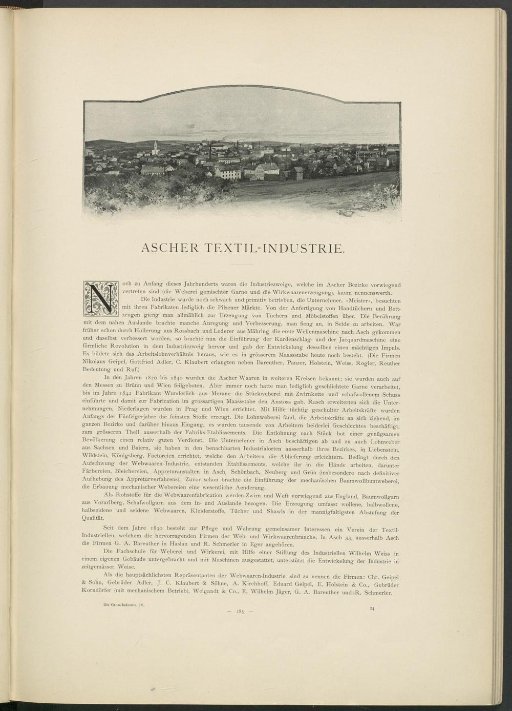 Seit dem Jahre 1890 besteht zur Pflege und Wahrung gemeinsamer Interessen ein Verein der Textil- Industriellen, welchem die hervorragenden Firmen der Web- und Wirkwaarenbranche, in Asch 33, ausserhalb Asch die Firmen G. A. Bareuther in Haslau und R. Schmerler in Eger angehören.