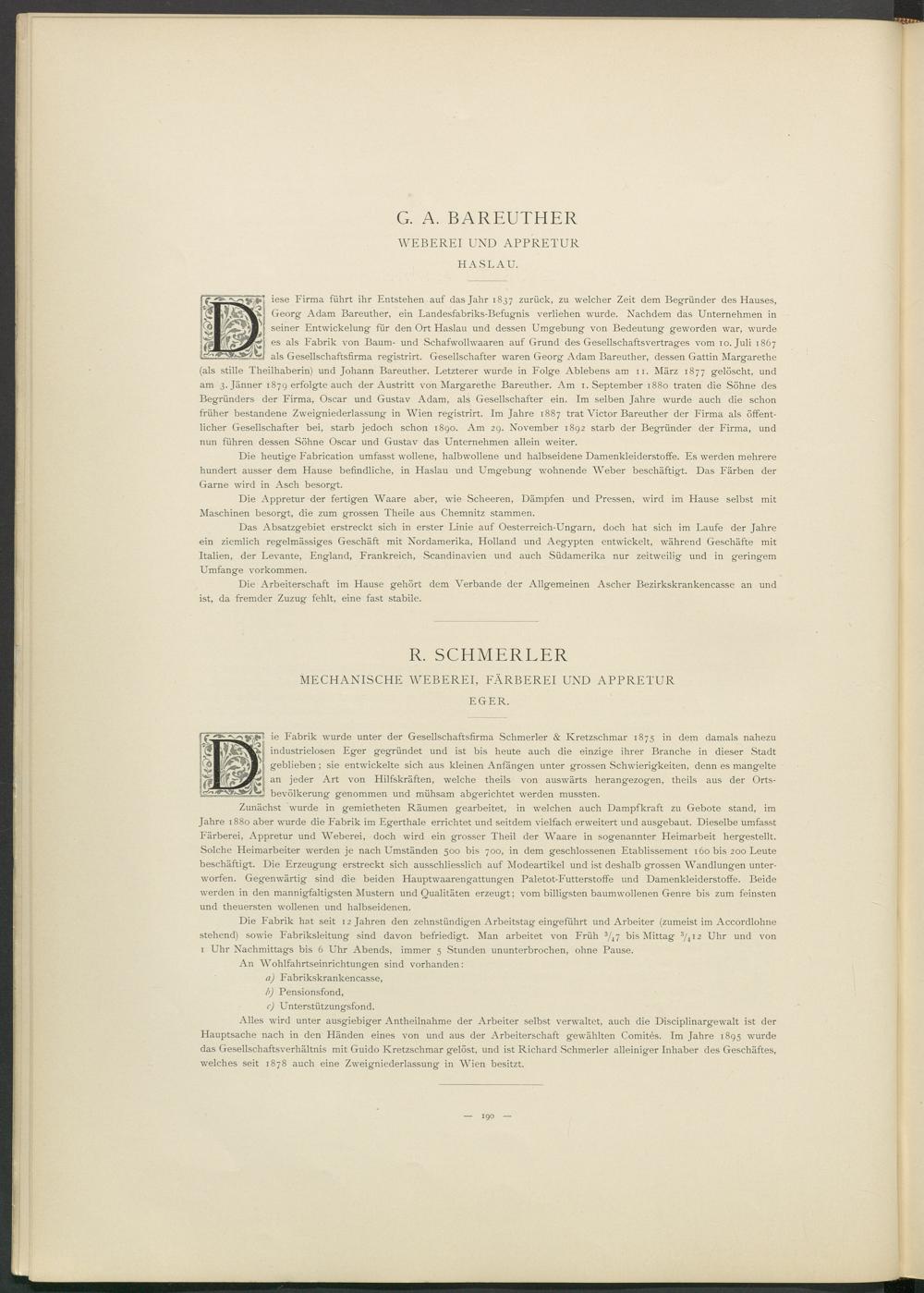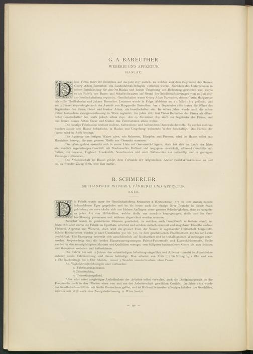 iese Firma führt ihr Entstehen auf das Jahr 1837 zurück, zu welcher Zeit dem Begründer des Hauses, Georg Adam Bareuther, ein Landesfabriks-Befugnis verliehen wurde. Nachdem das Unternehmen in seiner Entwickelung für den Ort Haslau und dessen Umgebung von Bedeutung geworden war, wurde es als Fabrik von Baum- und Schafwolhvaaren auf Grund des Gesellschaftsvertrages vom 10. Juli 1867 als Gesellschaftsfirma registrirt. Gesellschafter waren Georg Adam Bareuther, dessen Gattin Margarethe (als stille Theilhaberin) und Johann Bareuther. Letzterer wurde in Folge Ablebens am 11. März 1877 gelöscht, und am 3. Jänner 1879 erfolgte auch der Austritt von Margarethe Bareuther. Am 1. September 1880 traten die Söhne des Begründers der Firma, Oscar und Gustav Adam, als Gesellschafter ein. Im selben Jahre wurde auch die schon früher bestandene Zweigniederlassung in Wien registrirt. Im Jahre 1887 trat Victor Bareuther der Firma als öffentlicher Gesellschafter bei, starb jedoch schon 1890. Am 29. November 1892 starb der Begründer der Firma, und nun führen dessen Söhne Oscar und Gustav das Unternehmen allein weiter.