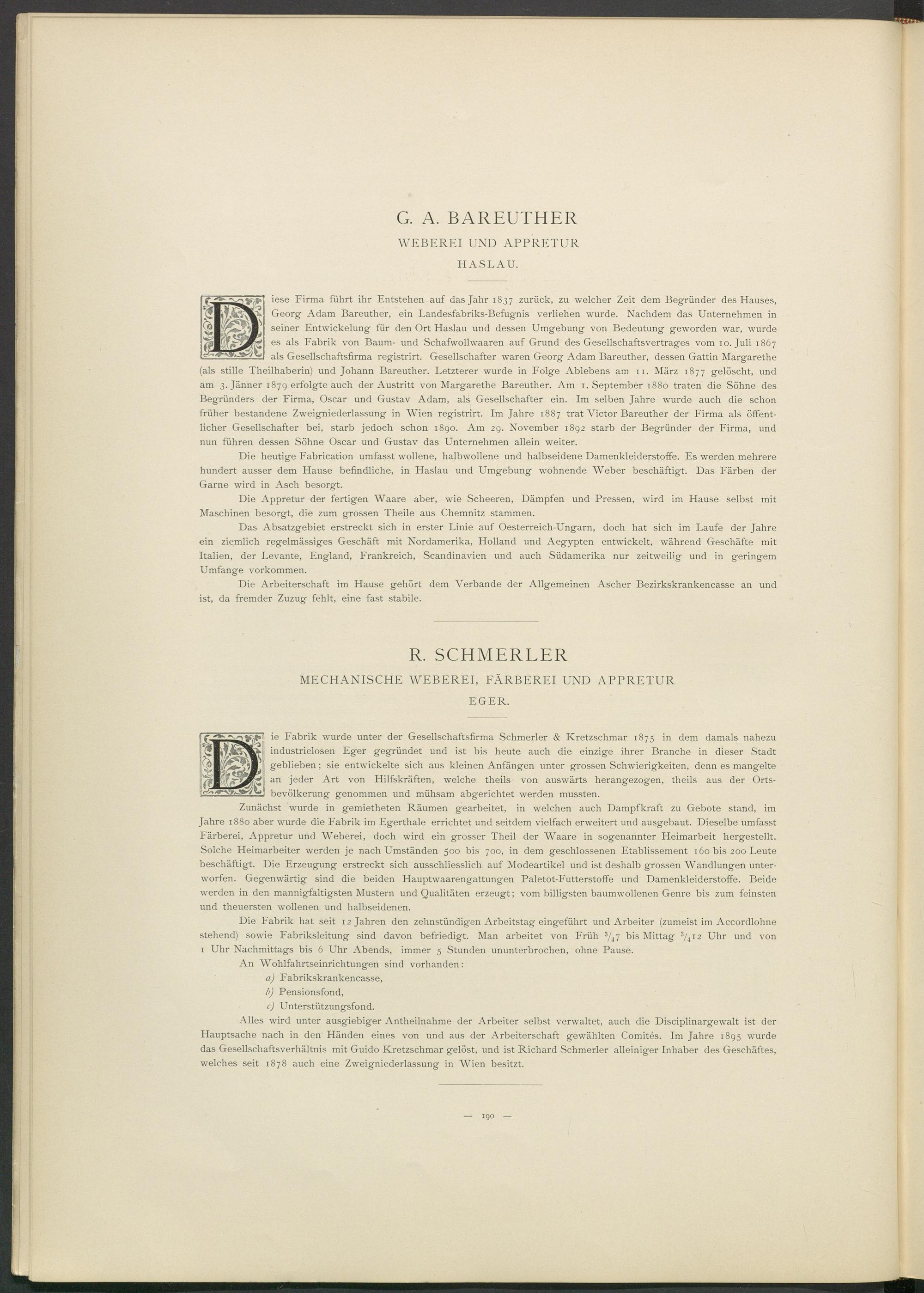 ie Fabrik wurde unter der Gesellschaftsfirma Schmerler & Kretzschmar 1875 in dem damals nahezu industrielosen Eger gegründet und ist bis heute auch die einzige ihrer Branche in dieser Stadt geblieben ; sie entwickelte sich aus kleinen Anfängen unter grossen Schwierigkeiten, denn es mangelte an jeder Art von Hilfskräften, welche theils von auswärts herangezogen, theils aus der Ortsbevölkerung genommen und mühsam abgerichtet werden mussten.