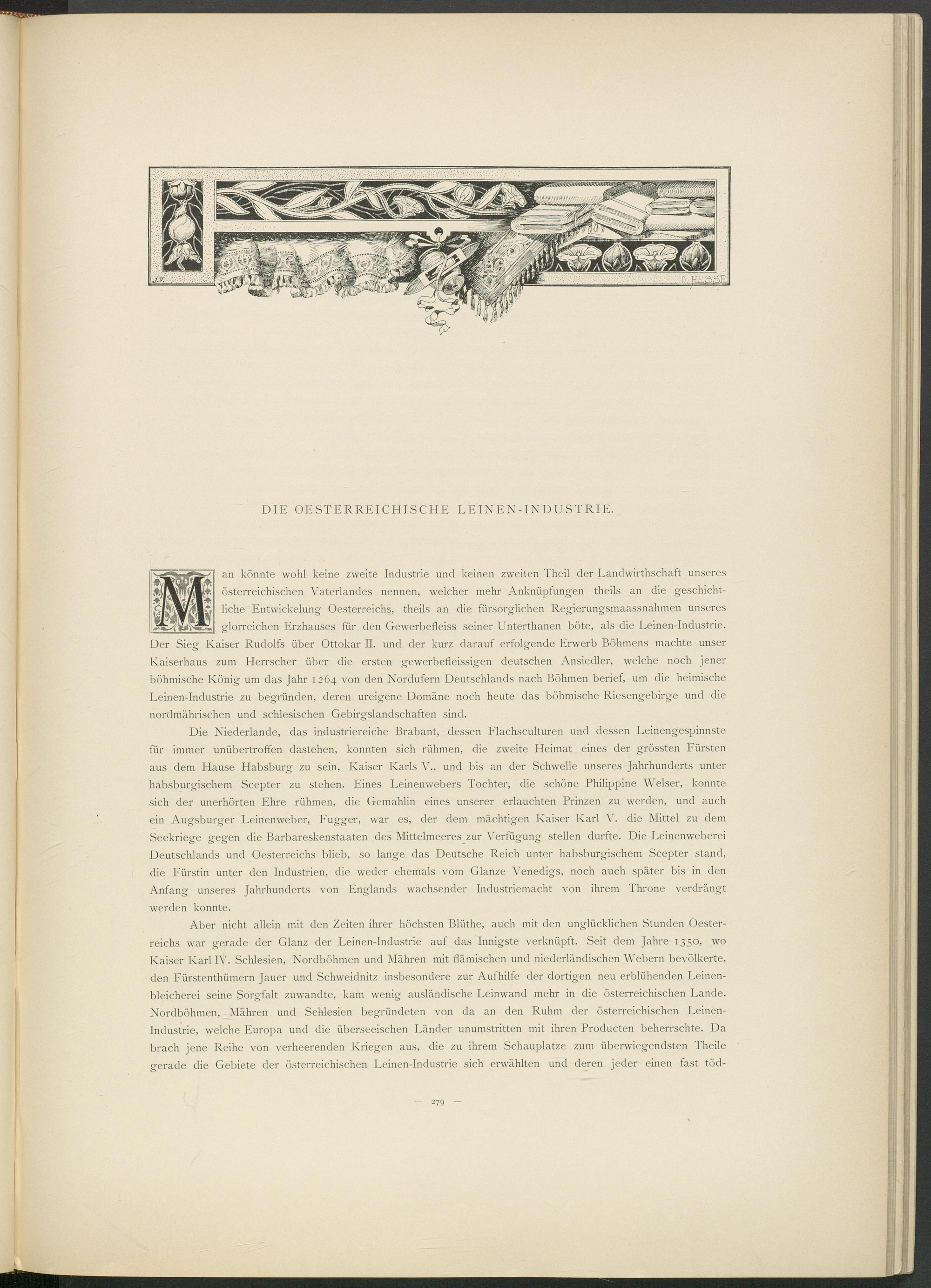 an könnte wohl keine zweite Industrie und keinen zweiten Theil der Eandwirthschaft unseres österreichischen Vaterlandes nennen, welcher mehr Anknüpfungen theils an die geschichtliche Entwickelung Oesterreichs, theils an die fürsorglichen Regierungsmaassnahmen unseres glorreichen Erzhauses für den Gewerbefleiss seiner Unterthanen böte, als die Leinen-Industrie. Der Sieg Kaiser Rudolfs über Ottokar II. und der kurz darauf erfolgende Erwerb Böhmens machte unser Kaiserhaus zum Herrscher über die ersten gewerbefleissigen deutschen Ansiedler, welche noch jener böhmische König um das Jahr 1264 von den Nordufern Deutschlands nach Böhmen berief, um die heimische Leinen-Industrie zu begründen, deren ureigene Domäne noch heute das böhmische Riesengebirge und die nordmährischen und schlesischen Gebirgslandschaften sind.