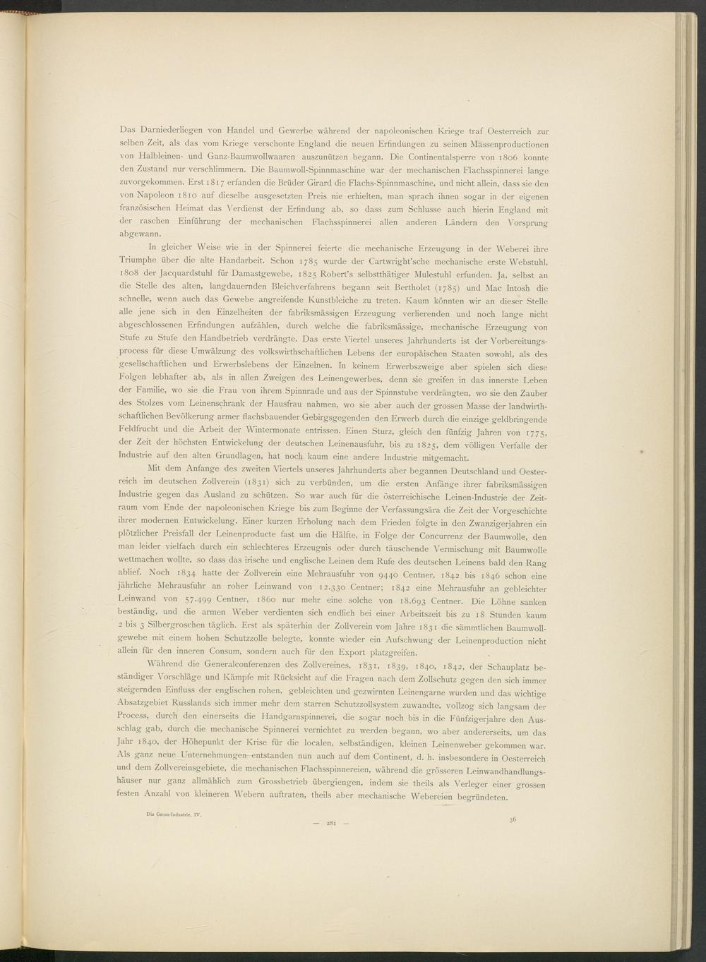 Während die Generalconferenzen des Zollvereines, 1831, 1839, 1840, 1842, der Schauplatz beständiger Vorschläge und Kämpfe mit Rücksicht auf die Fragen nach dem Zollschutz gegen den sich immer steigernden Einfluss der englischen rohen, gebleichten und gezwirnten Leinengarne wurden und das wichtige Absatzgebiet Russlands sich immer mehr dem starren Schutzzollsystem zuwandte, vollzog sich langsam der Process, durch den einerseits die Handgarnspinnerei, die sogar noch bis in die Fünfzigerjahre den Ausschlag gab, durch die mechanische Spinnerei vernichtet zu werden begann, wo aber andererseits, um das Jahr 1840, der Höhepunkt der Krise für die localen, selbständigen, kleinen Leinenweber gekommen war. Als ganz neue_Unternehmungen entstanden nun auch auf dem Continent, d. h. insbesondere in Oesterreich und dem Zollvereinsgebiete, die mechanischen Flachsspinnereien, während die grösseren Leinwandhandlungshäuser nur ganz allmählich zum Grossbetrieb übergiengen, indem sie theils als Verleger einer grossen festen Anzahl von kleineren Webern auftraten, theils aber mechanische Webereien begründeten.
