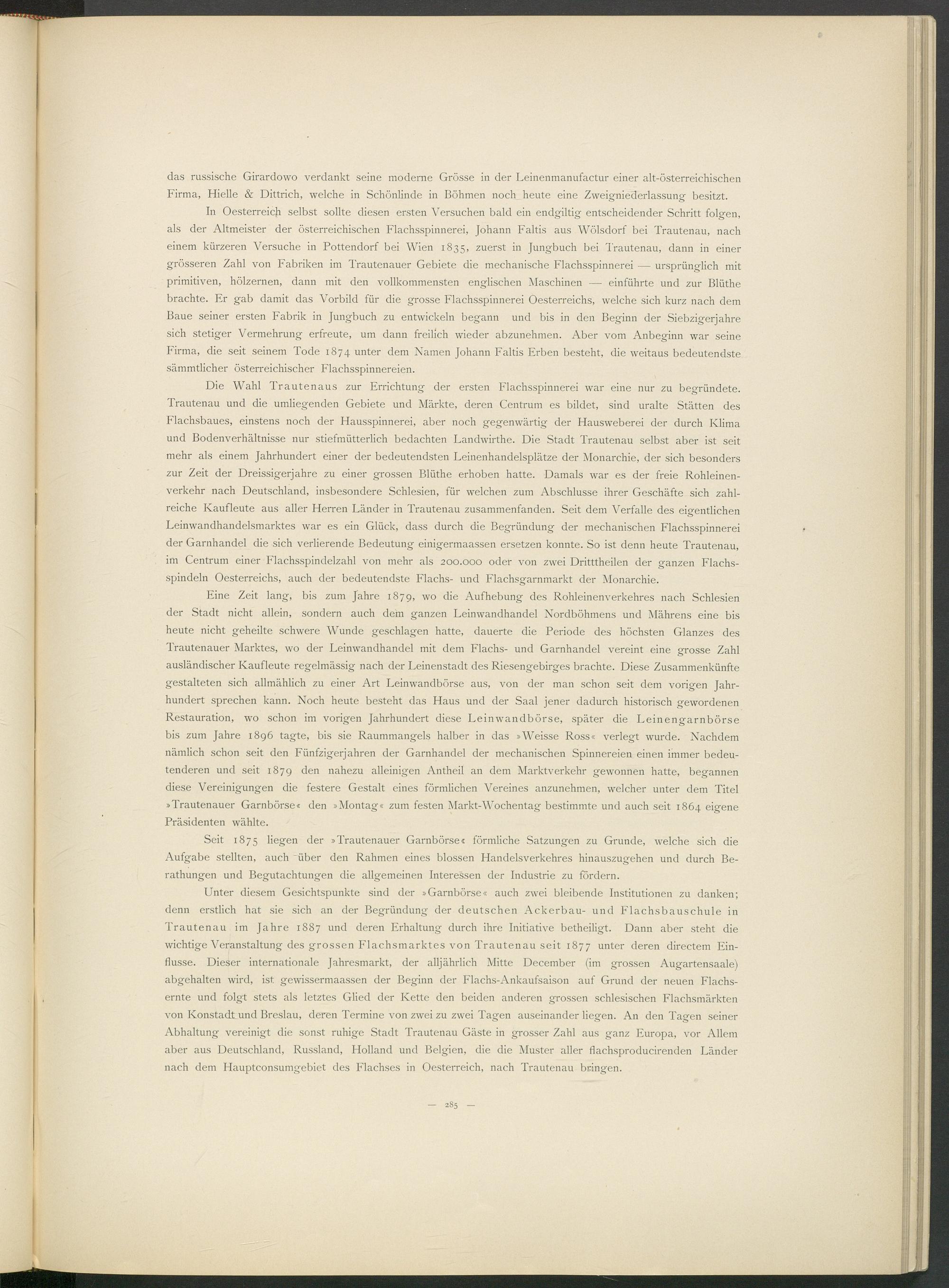 Unter diesem Gesichtspunkte sind der »Garnbörse« auch zwei bleibende Institutionen zu danken; denn erstlich hat sie sich an der Begründung der deutschen Ackerbau- und Flachsbauschule in Trautenau im Jahre 1887 und deren Erhaltung durch ihre Initiative betheiligt. Dann aber steht die wichtige Veranstaltung des grossen Flachsmarktes von Trautenau seit 1877 unter deren directem Einflüsse. Dieser internationale Jahresmarkt, der alljährlich Mitte December (im grossen Augartensaale) abgehalten wird, ist gewissermaassen der Beginn der Flachs-Ankaufsaison auf Grund der neuen Flachsernte und folgt stets als letztes Glied der Kette den beiden anderen grossen schlesischen Flachsmärkten von Konstadt und Breslau, deren Termine von zwei zu zwei Tagen auseinander liegen. An den Tagen seiner Abhaltung vereinigt die sonst ruhige Stadt Trautenau Gäste in grosser Zahl aus ganz Europa, vor Allem aber aus Deutschland, Russland, Holland und Belgien, die die Muster aller flachsproducirenden Länder nach dem Hauptconsumgebiet des Flachses in Oesterreich, nach Trautenau bringen.